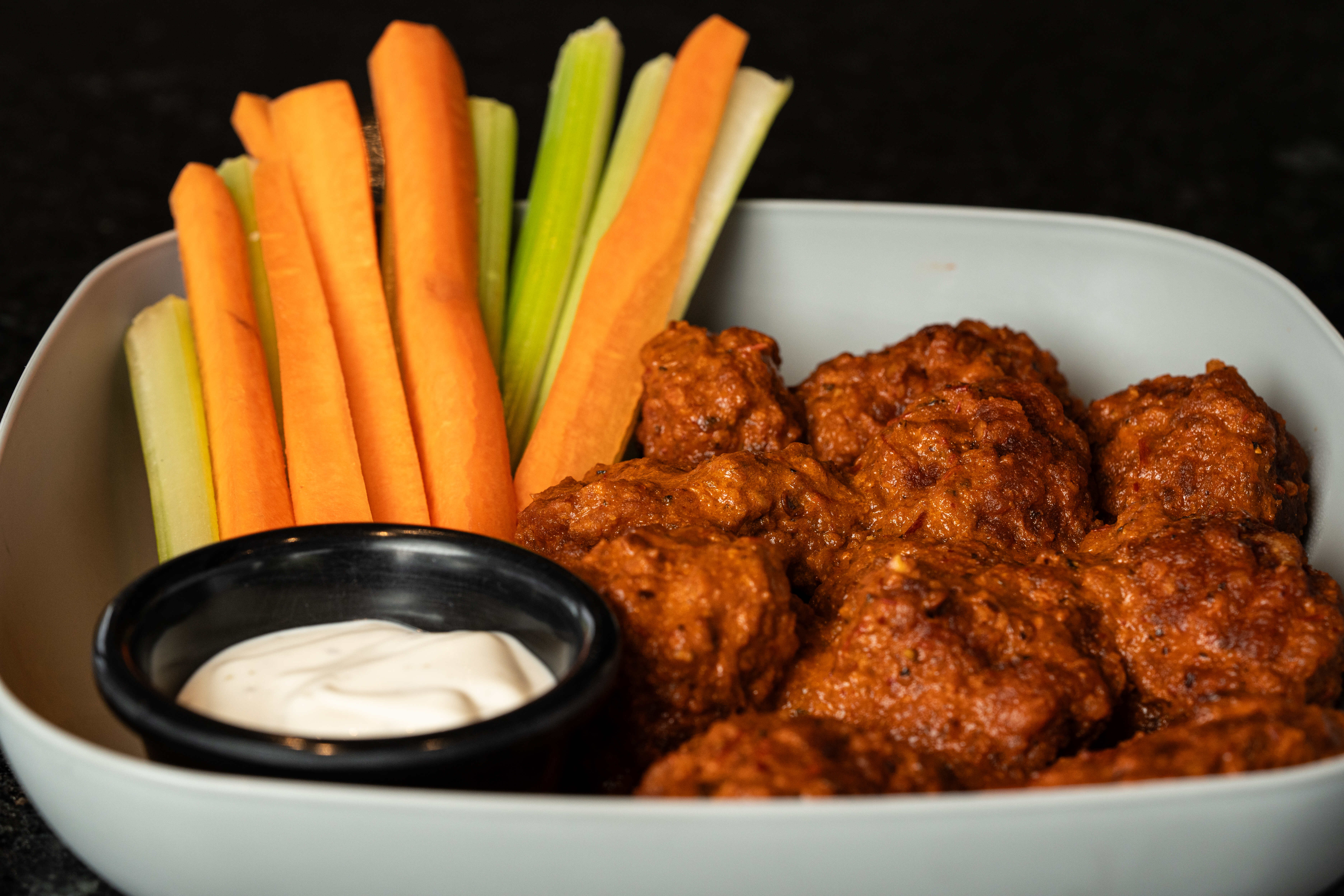 340 GRAMOS DE BONELESS BAÑADOS EN SALSA BUFFALO, ACOMPAÑADOS DE BASTONES DE APIO, ZANAHORIA Y ADEREZO RANCH.