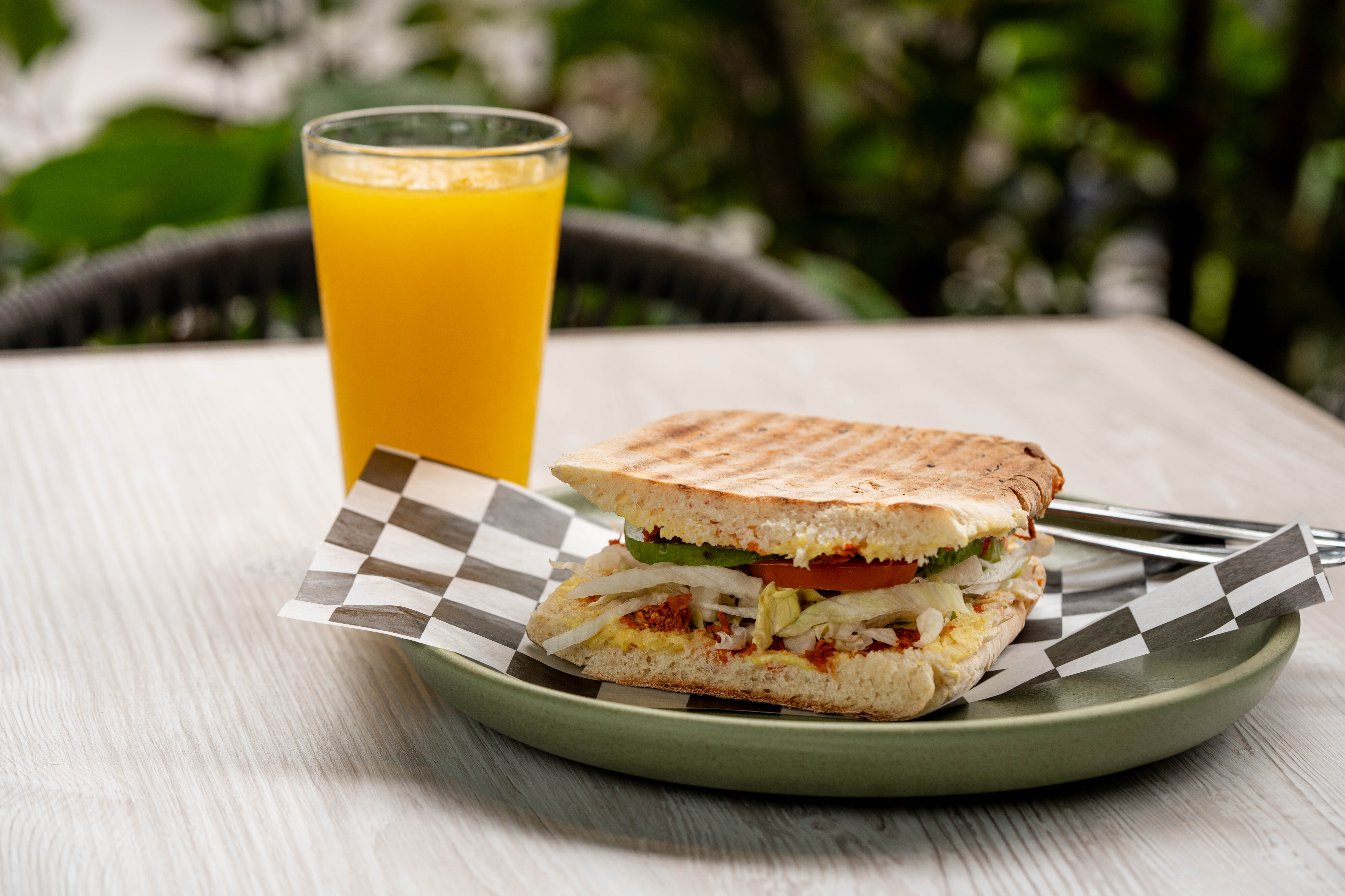TORTA HECHA CON PAN TELERA DORADITO UNTADO CON EL ADEREZO DE LA CASA, CON PANELA, LECHUGA, JITOMATE, CEBOLLA, AGUACATE Y CHILE JALAPEÑO