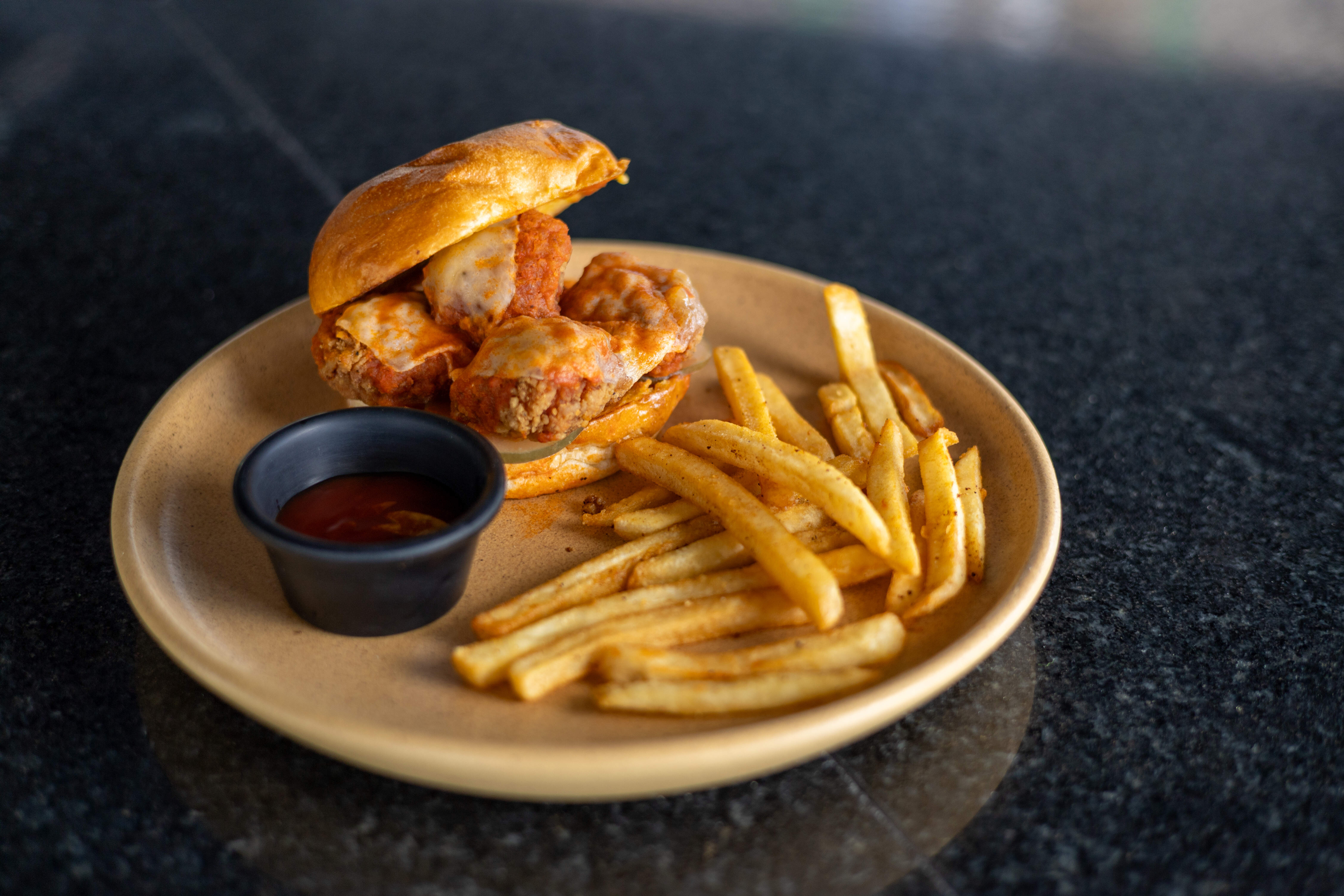 HAMBURGUESA MONTADA SOBRE PAN BRIOCHE UNTADO CON EL ADEREZO DE LA CASA, BONELESS BAÑADOS EN LA SALSA DE TU ELECCION, QUESO MANCHEGO Y ACOMPAÑADO CON PAPAS A LA FRANCESA