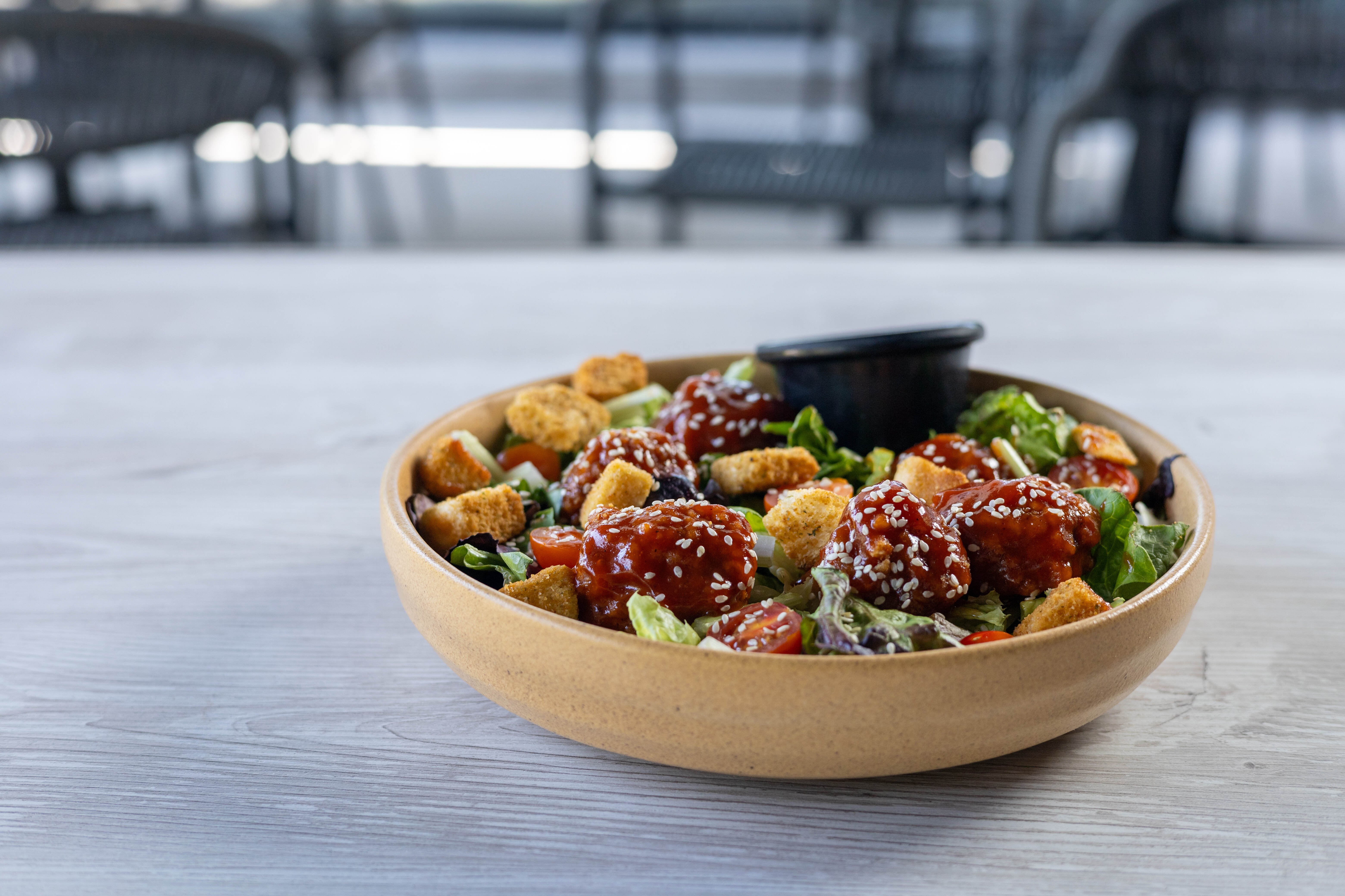MIX DE LECHUGAS FRESCAS CON CROTONES, APIO, BONELESS BBQ, AJONJOLI BLANCO Y ADEREZO RANCH