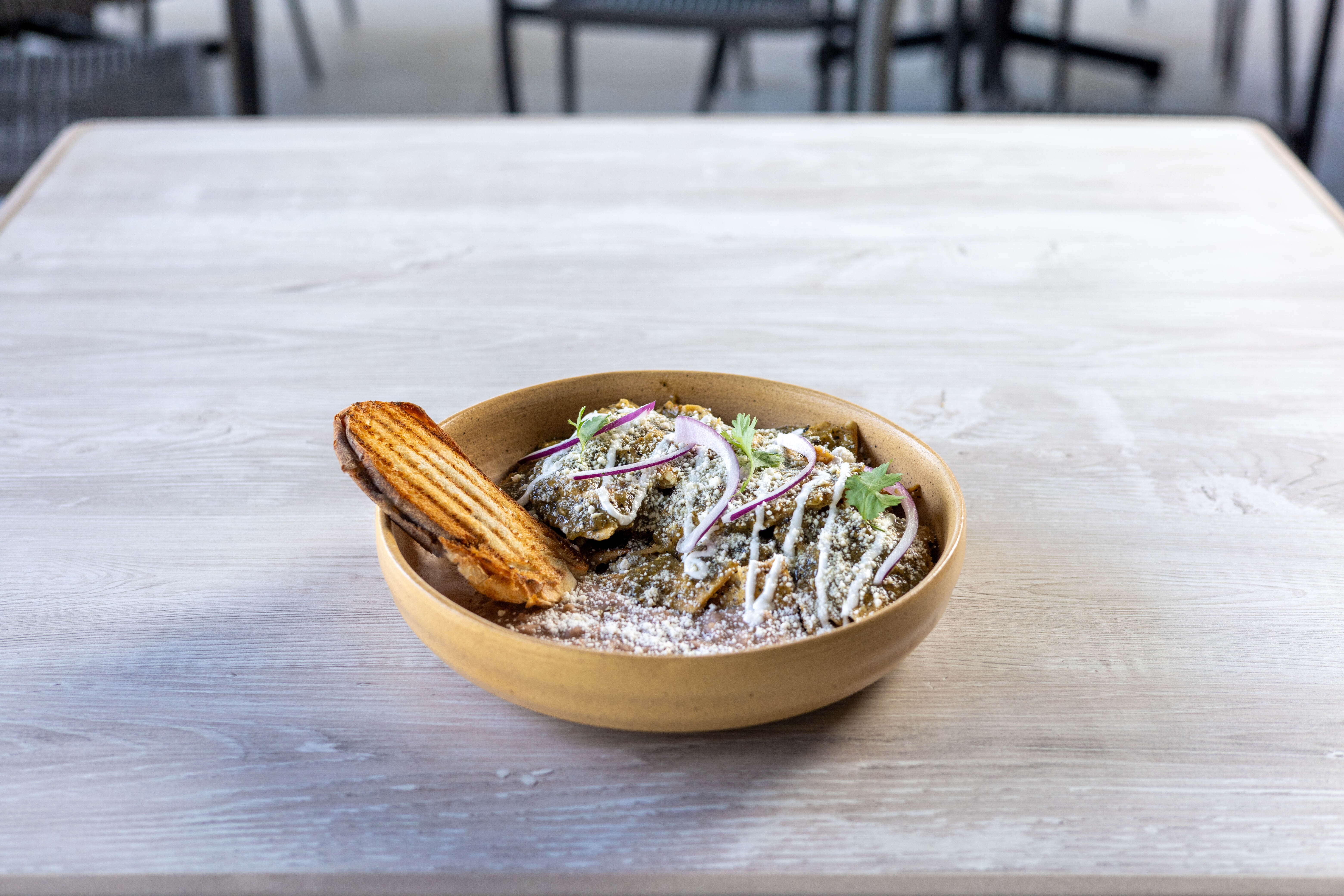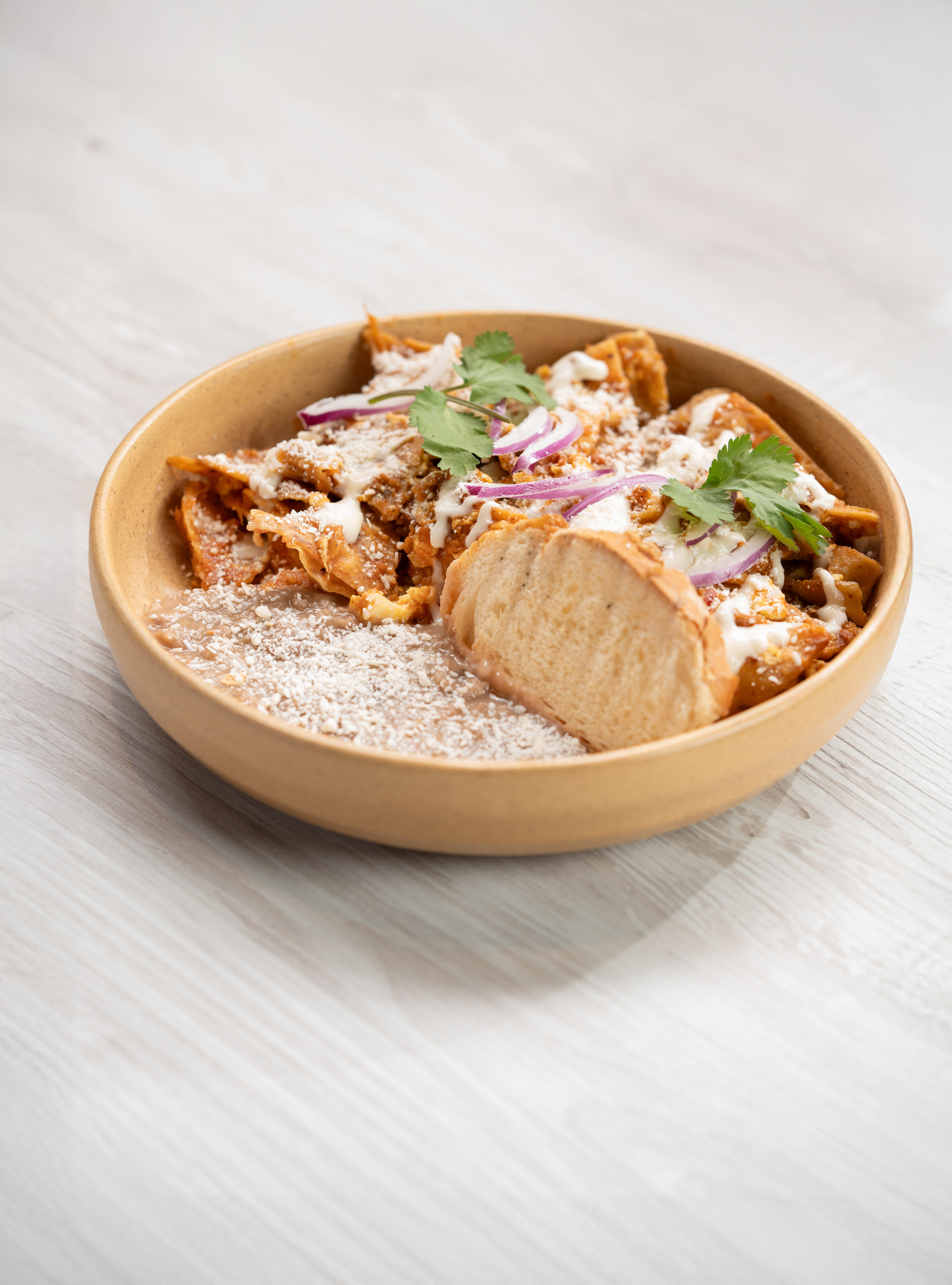 CHILAQUILES MEZCLADOS CON HUEVO, BAÑADOS CON SALSA VERDE, CON QUESO RALLADO, CREMA, CEBOLLA MORADA Y CILANTRO, ACOMPAÑADOS CON FRIJOLES FRITOS Y UNA REBANADA DE PAN TOSTADO
