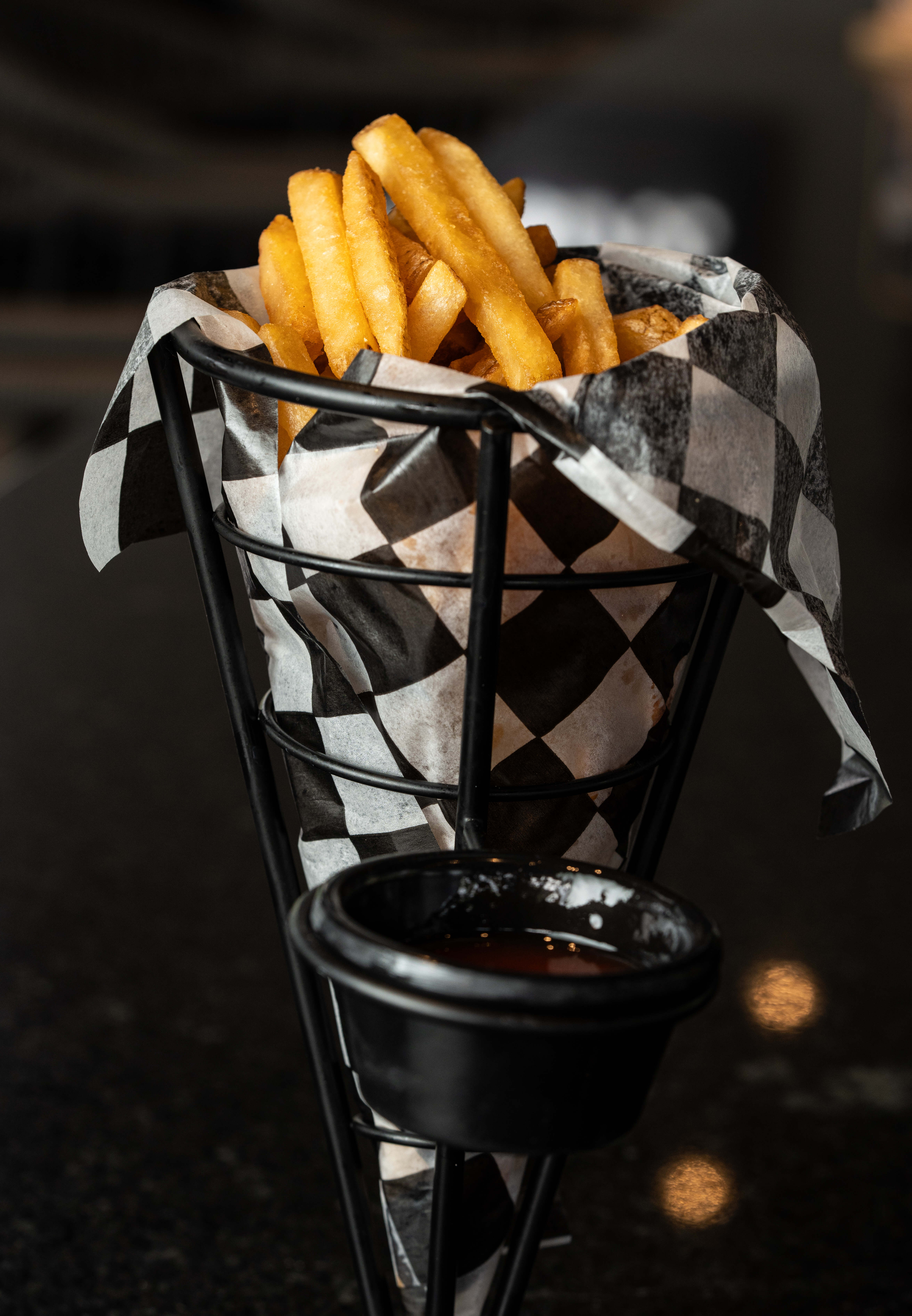 HAMBURGUESA CON PAN BRIOCHE UNTADO CON ADEREZO DE LA CASA, CARNE CASERA, QUESO AMERICANO, CEBOLLA CARAMELIZADA, LECHUGA, JITOMATE, CEBOLLA MORADA Y CHILES JALAPEÑOS, ACOMPAÑADA DE PAPAS A LA FRANCESA Y SALSA CATSUP.