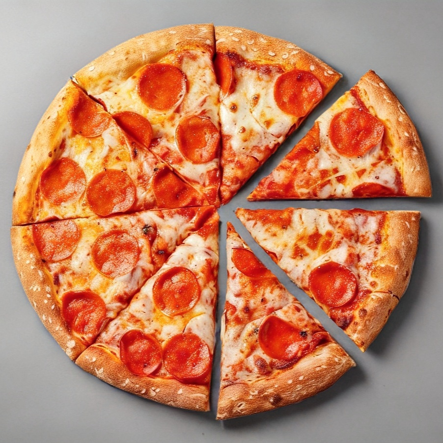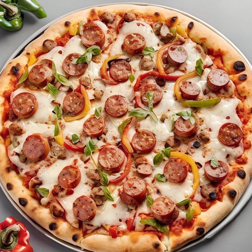 Masa artesanal con mantequilla, salsa de tomate, Queso, Peperoni, Salchicha, Jamón.