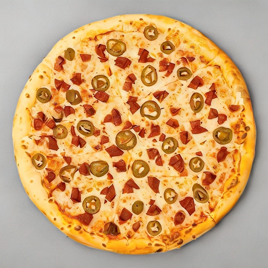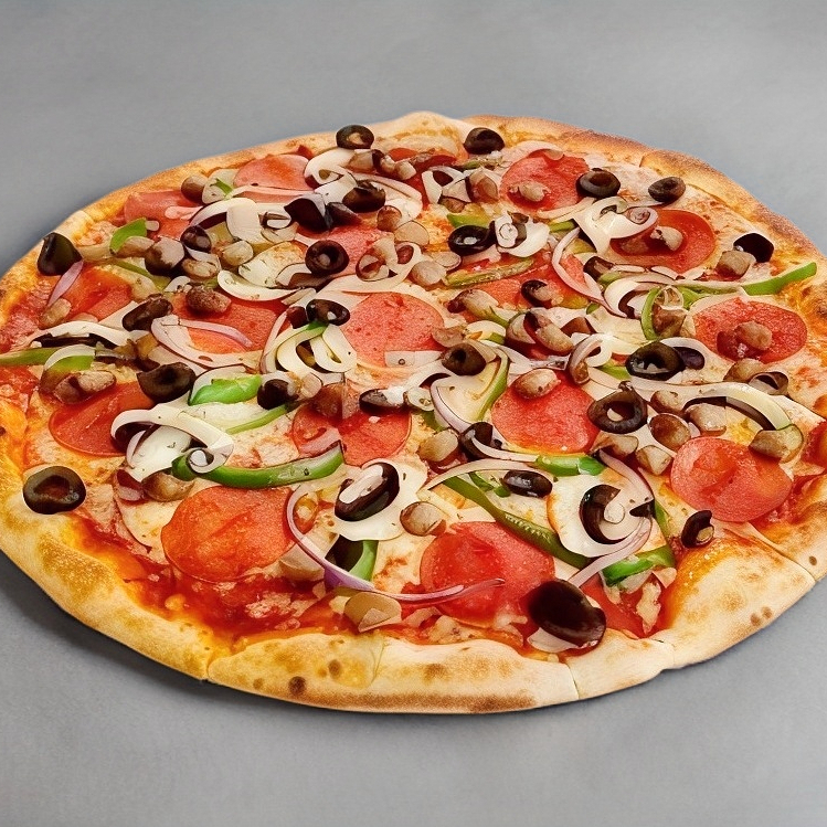 Masa artesanal con mantequilla, salsa de tomate, queso, peperoni, morron, cebolla, champiñones, aceitunas,