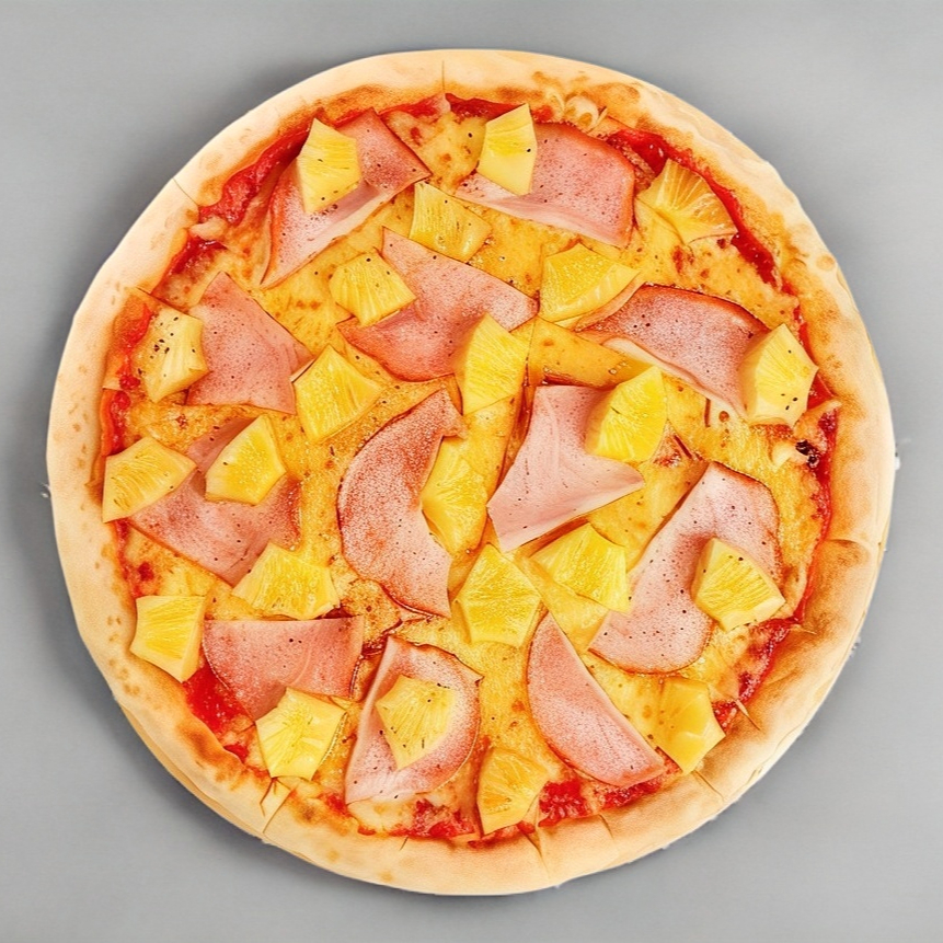 Masa artesanal con mantequilla, salsa de tomate, queso, piña, jamón, queso extra.