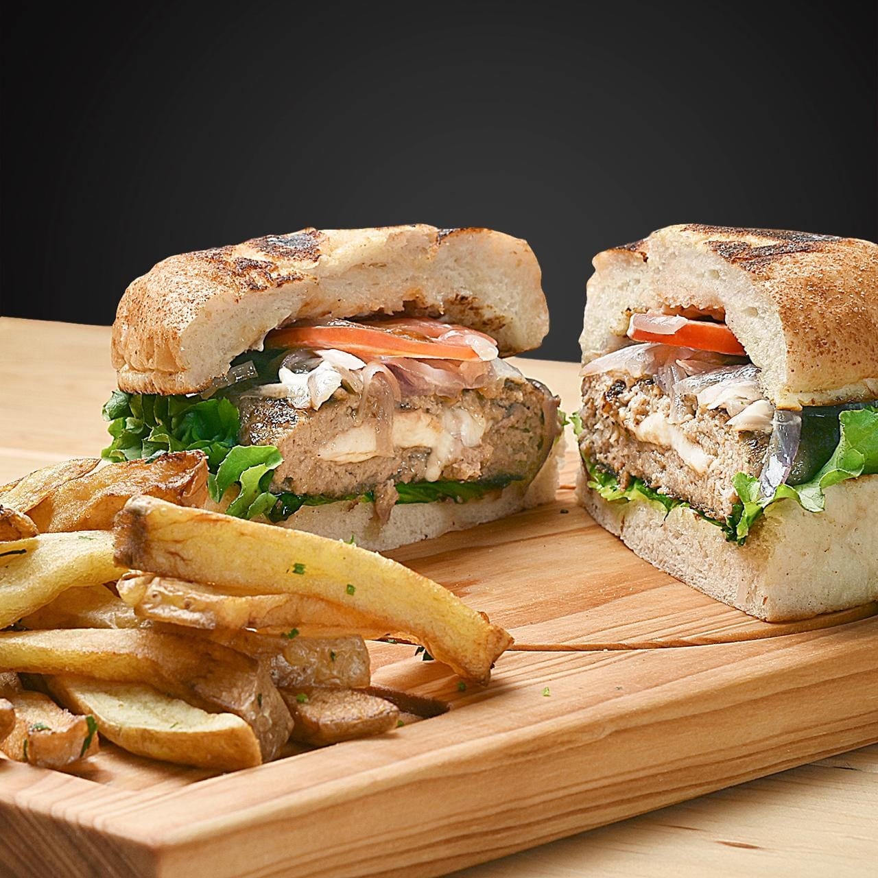 D'res. Rellena de queso monterrey jack y cebolla caramelizada. Todas nuestras hamburguesas están hechas con 170g de carne 100%.