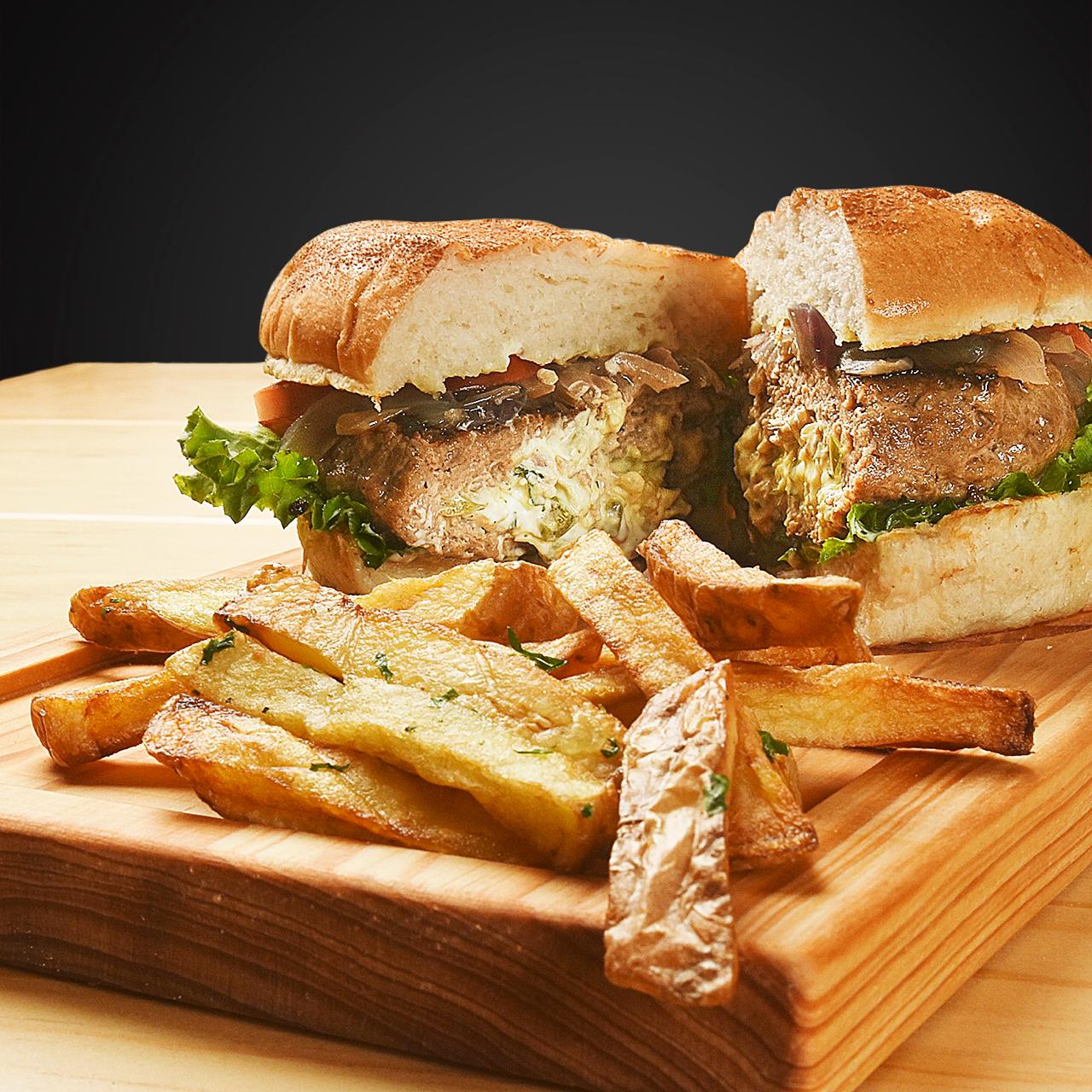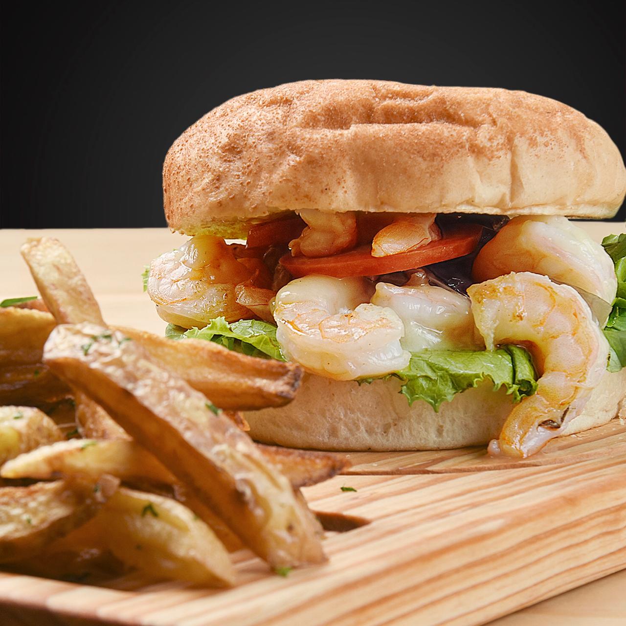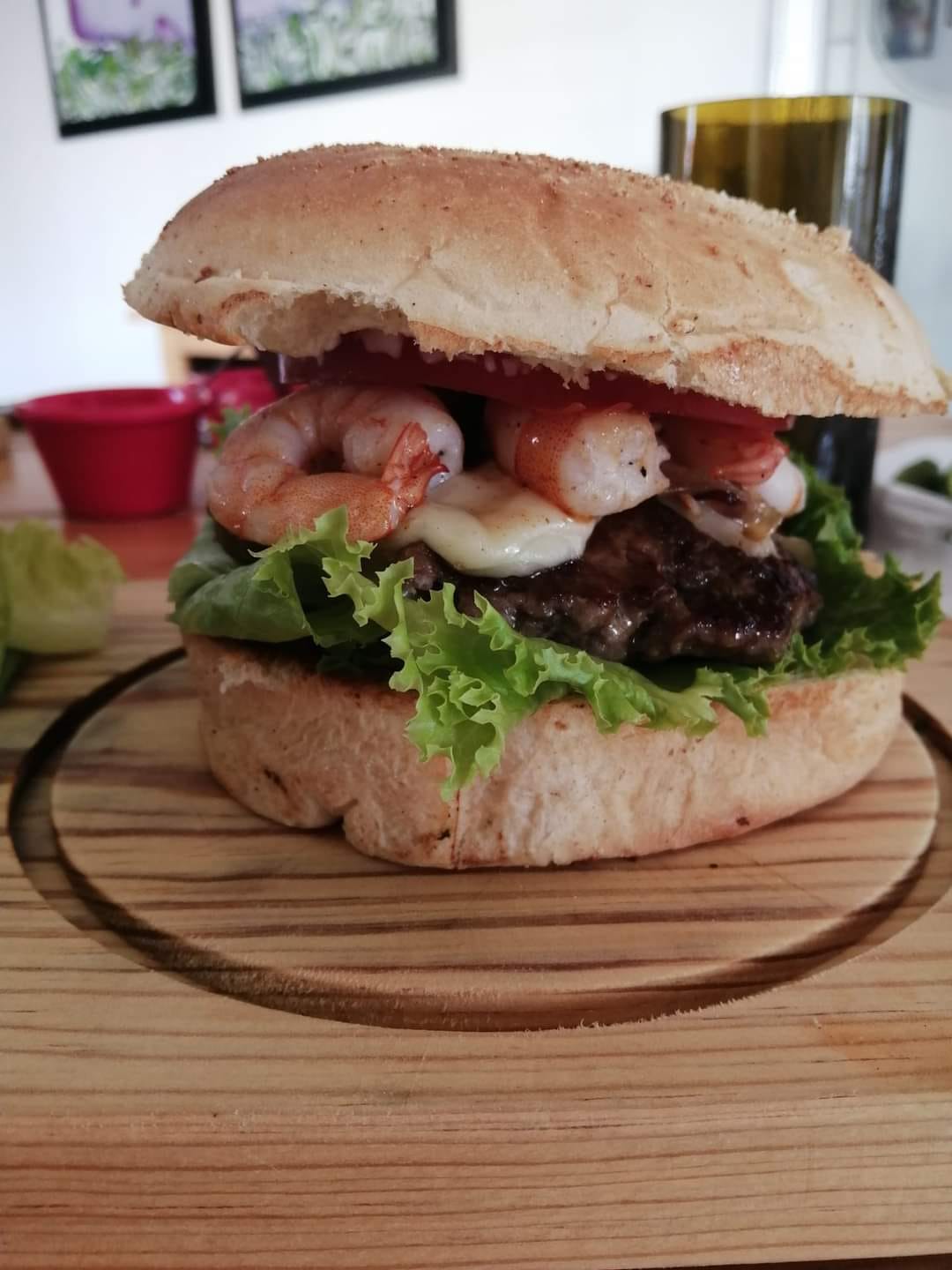 Carne de res con camarones a la mantequilla con queso. Todas nuestras hamburguesas están hechas con 170g de carne 100%.