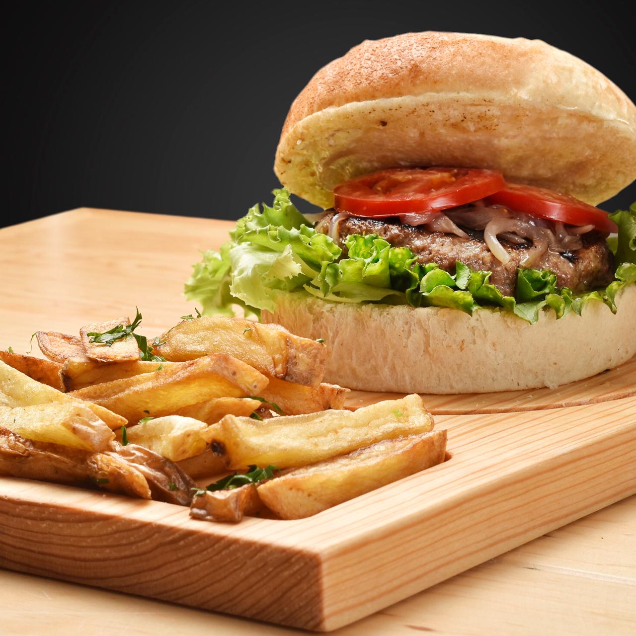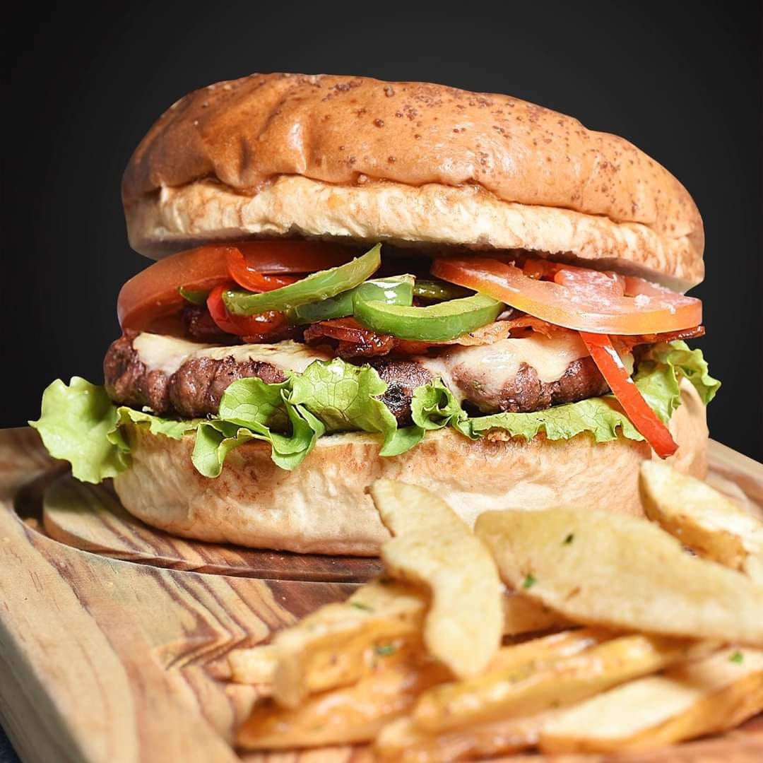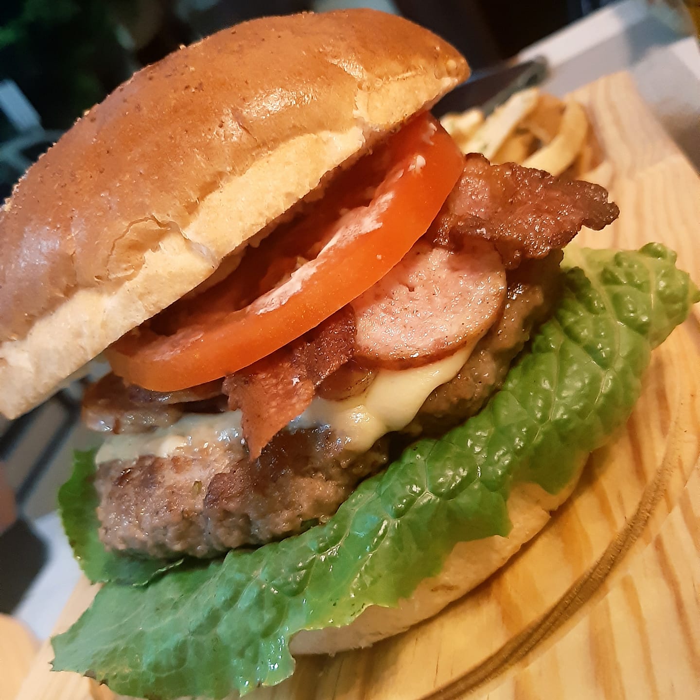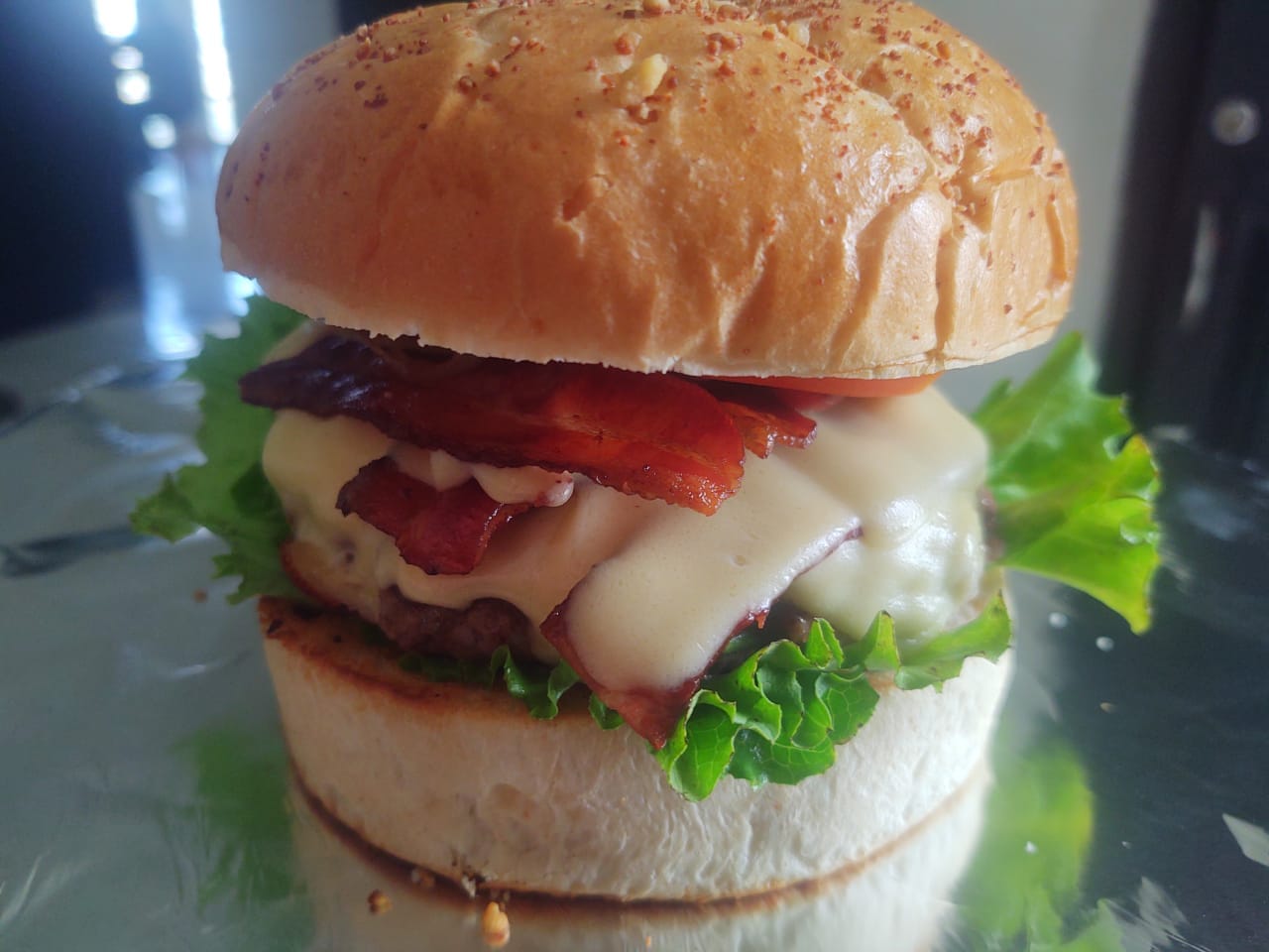 Intensa burger de carne, bañada en queso derretido, coronada con tocino doradito y cebolla caramelizada.