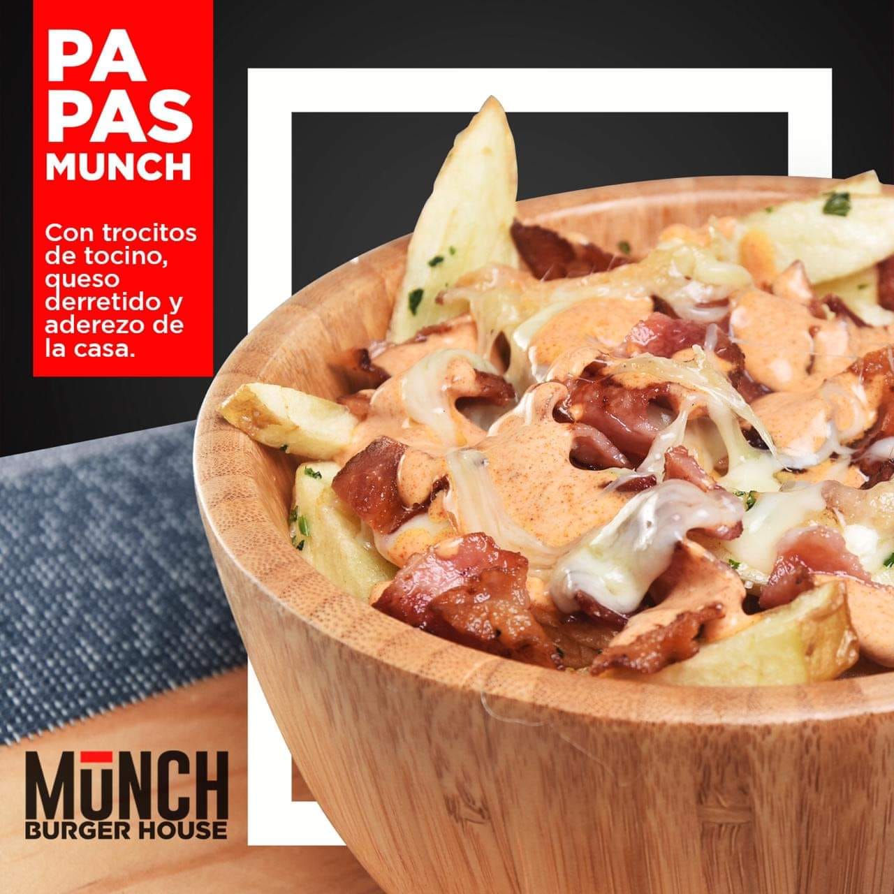 Con trocitos de tocino, queso derretido y aderezo de la casa.