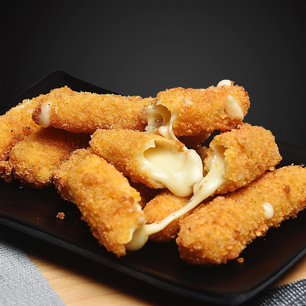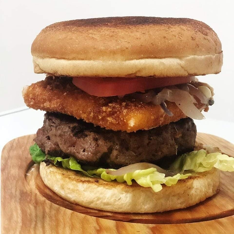 Queso frito y cebolla caramelizada. Todas nuestras hamburguesas están hechas con 170g de carne 100%.