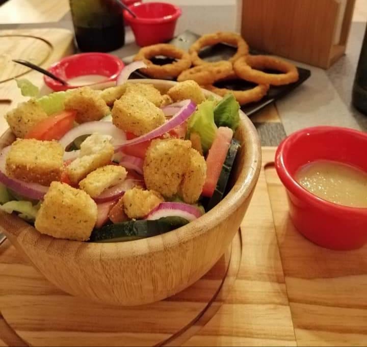 Lechuga, jitomate, cebolla, pepino, crutones y vinagreta de la casa.