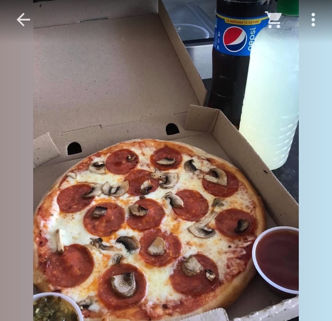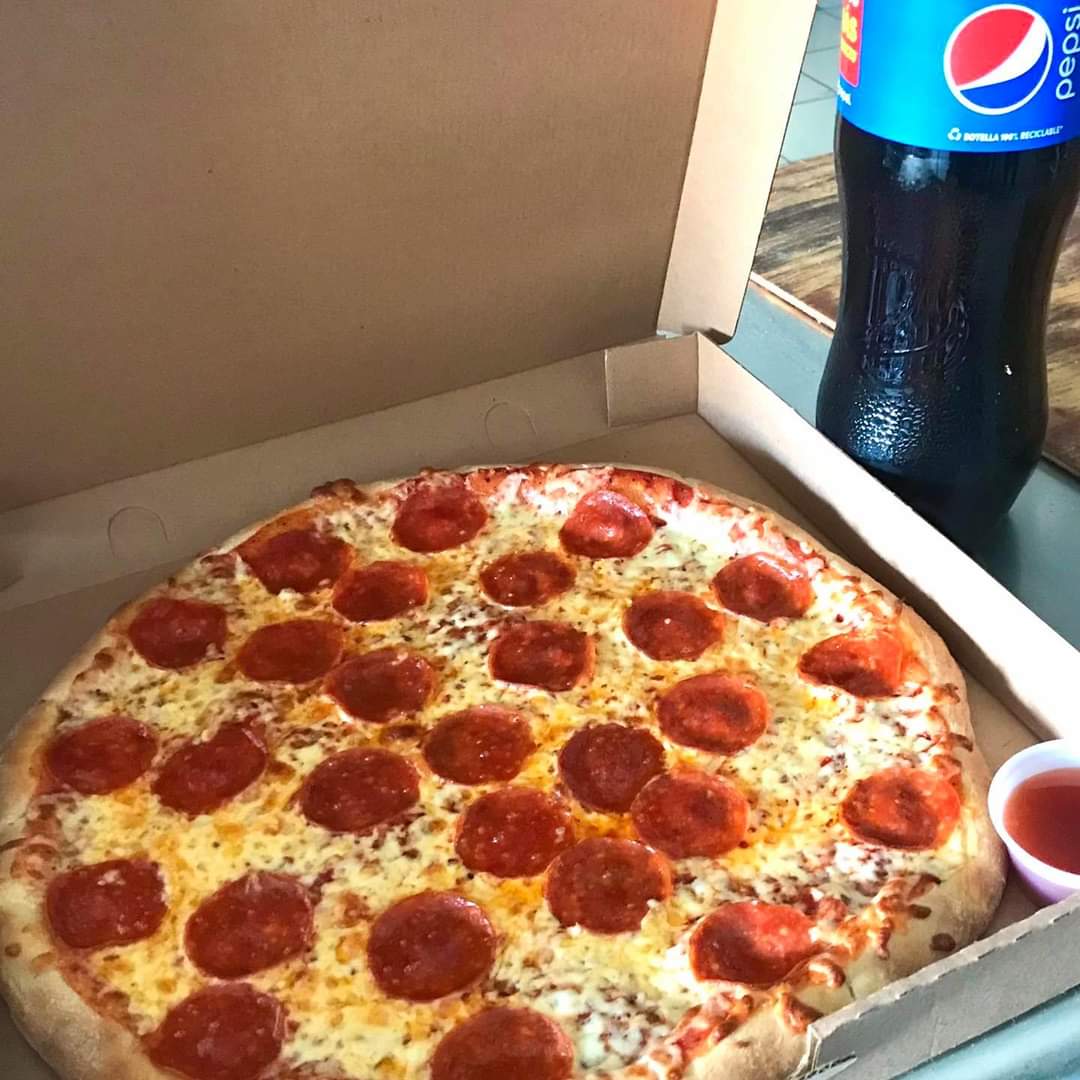 Pizza Grande de Peperoni o Queso acompañada de Pepsi de 1.75 lts. chimichurris y salsa catsup.