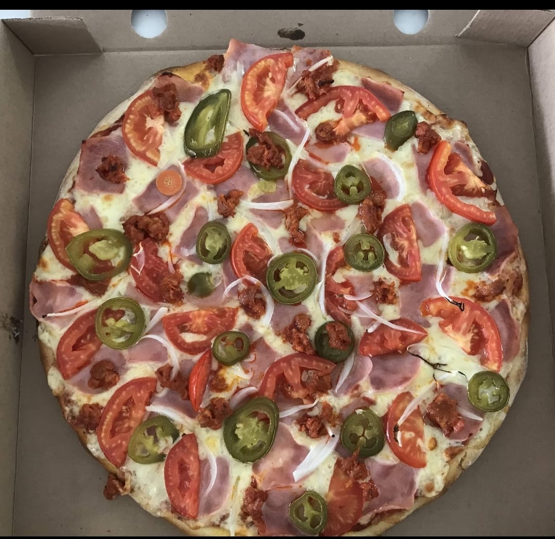 Jamón, tomate, cebolla, jalapeños y chorizo.