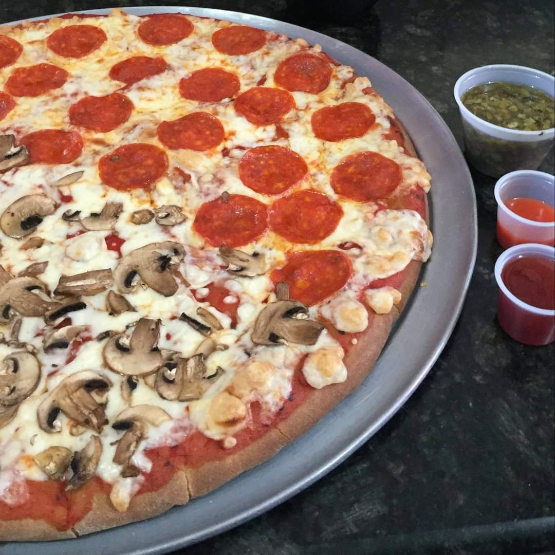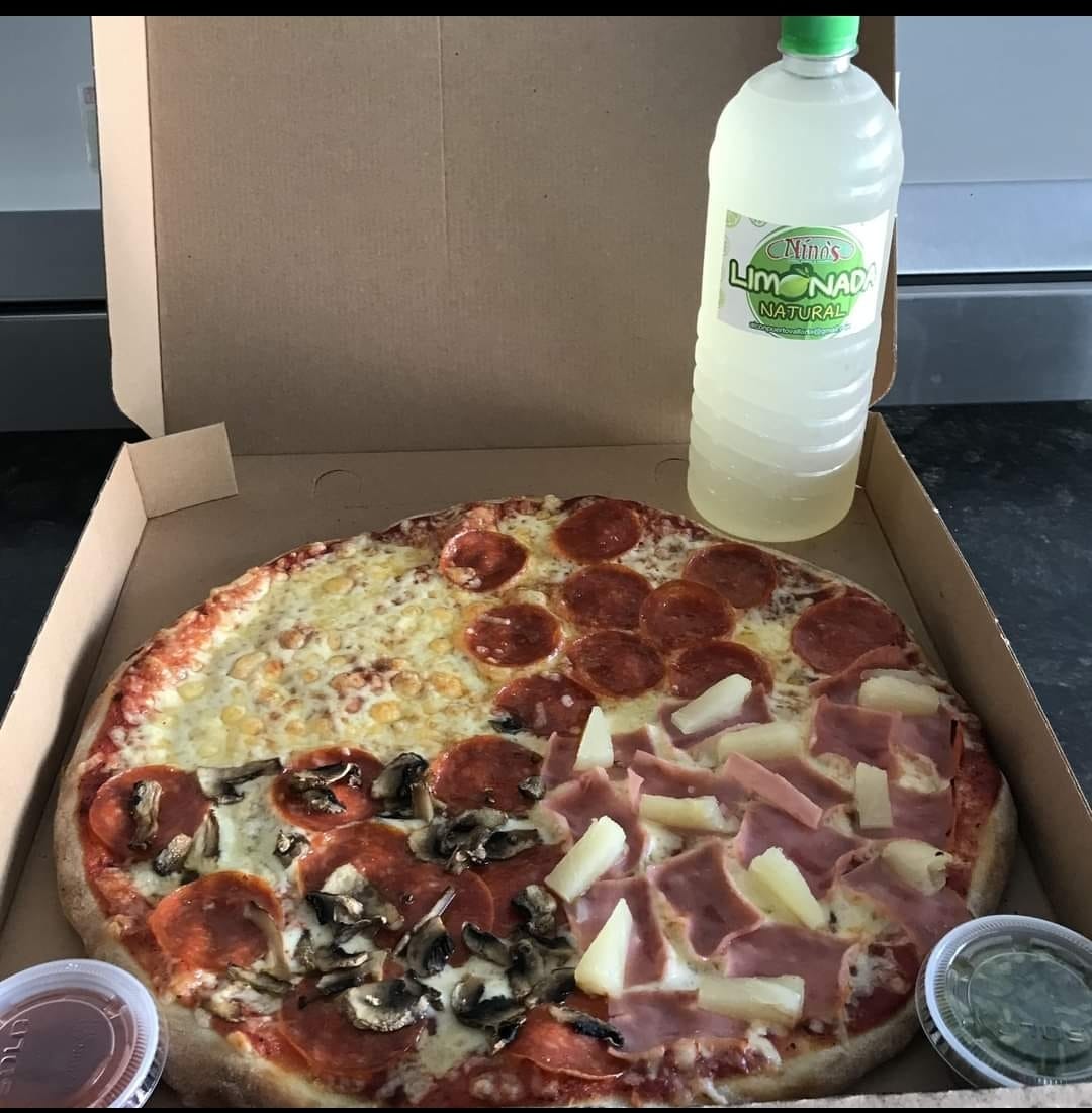 Deliciosa pizza tamaño Grande de 4 sabores (Queso, Peperoni y champiñón, Hawaiana y Peperoni. Y Limonada natural de 1 lt.