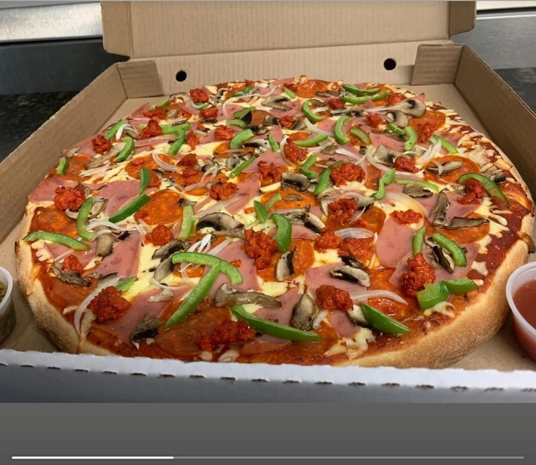 Peperoni, jamón, champiñón, cebolla, pimiento verde y chorizo.