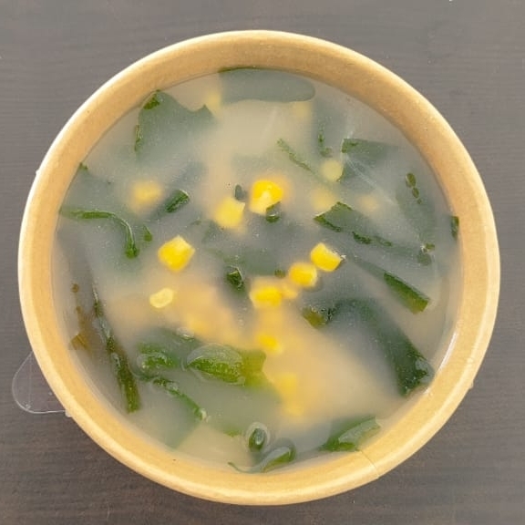 500 ml de caldo complementado con fideo de arroz, alga wakame hidratada, granos de elote y naruto.
