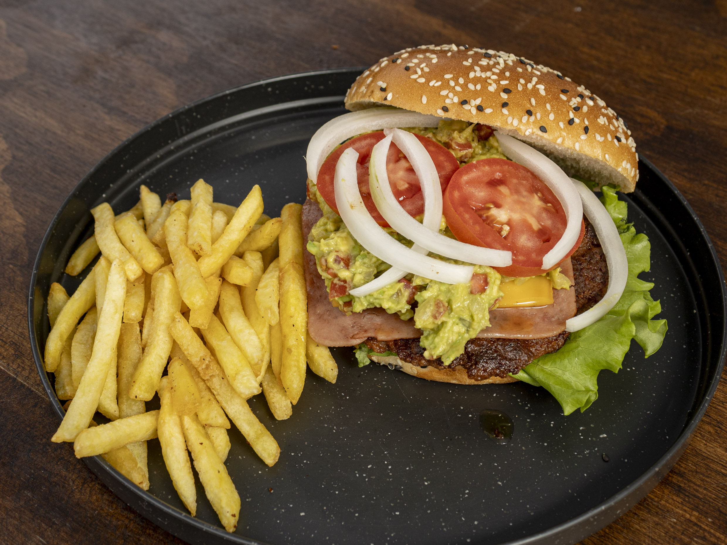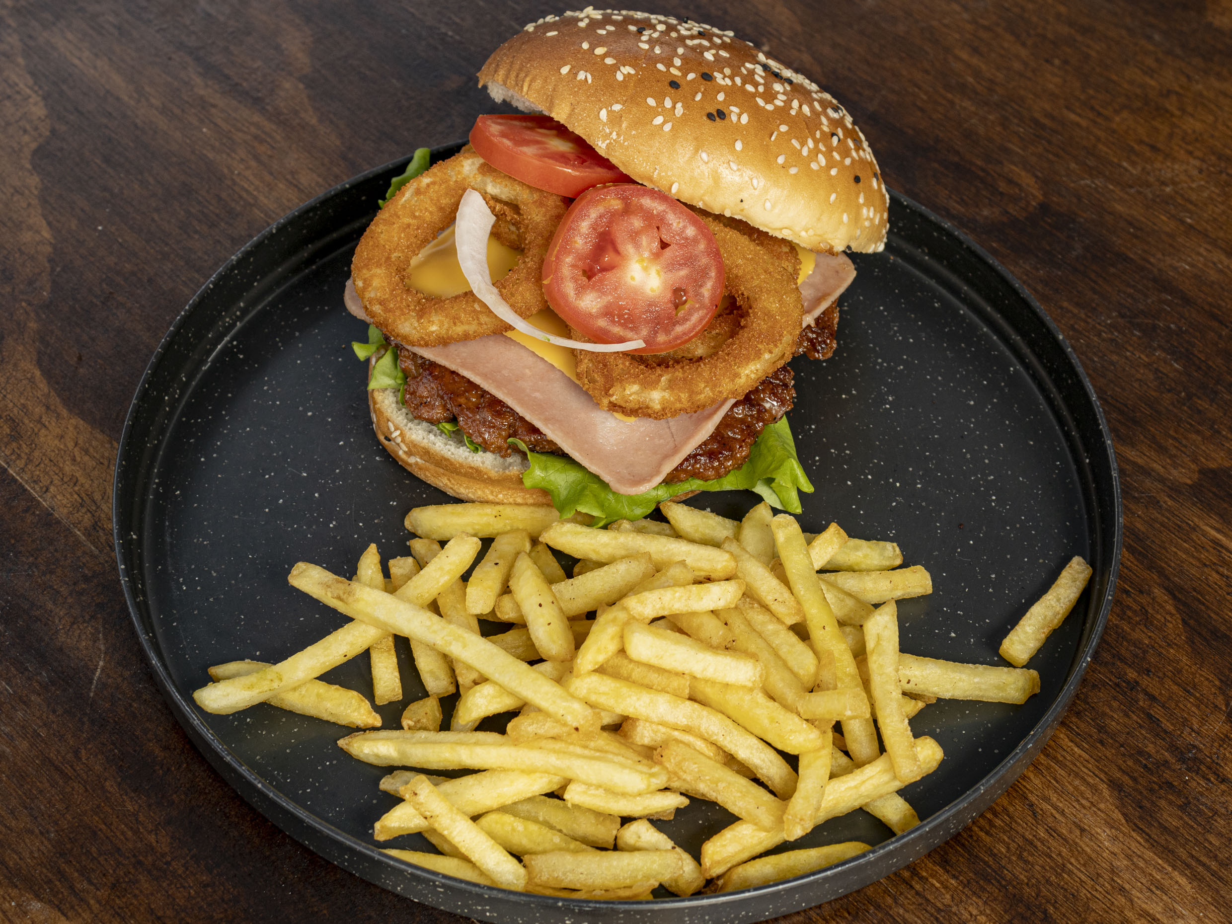 Carne de la casa, con jamon, queso amarillo, vegetales y aros de cebolla. Incluye papas.