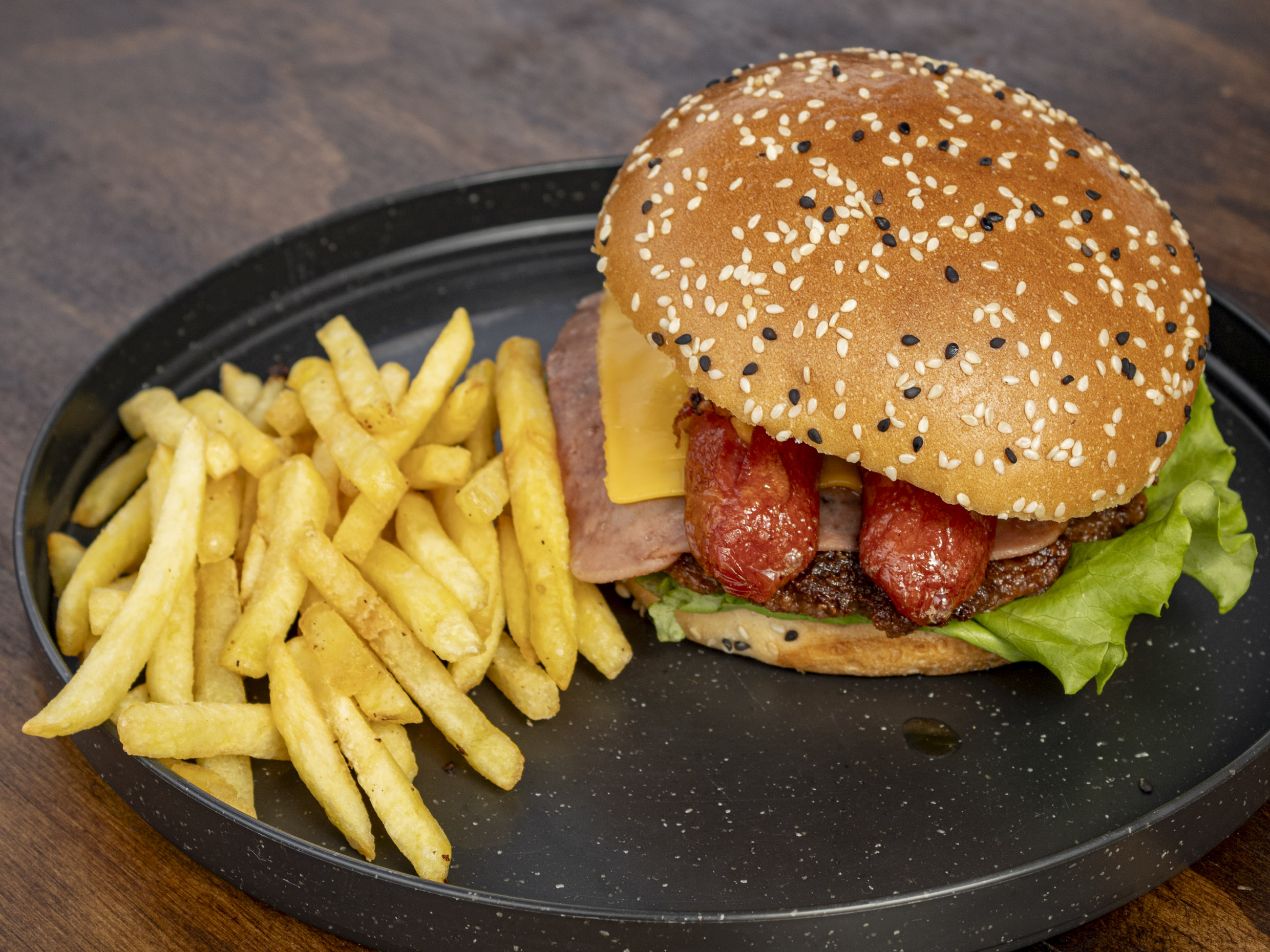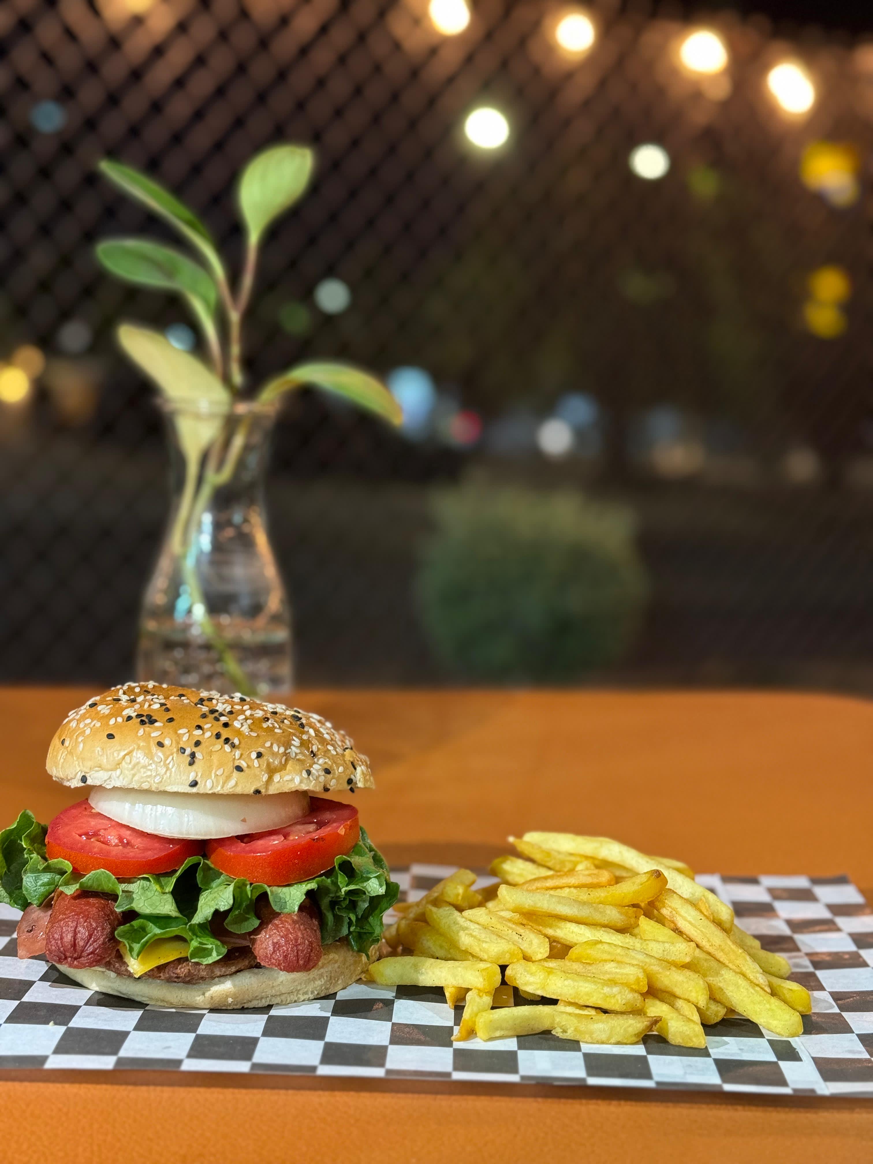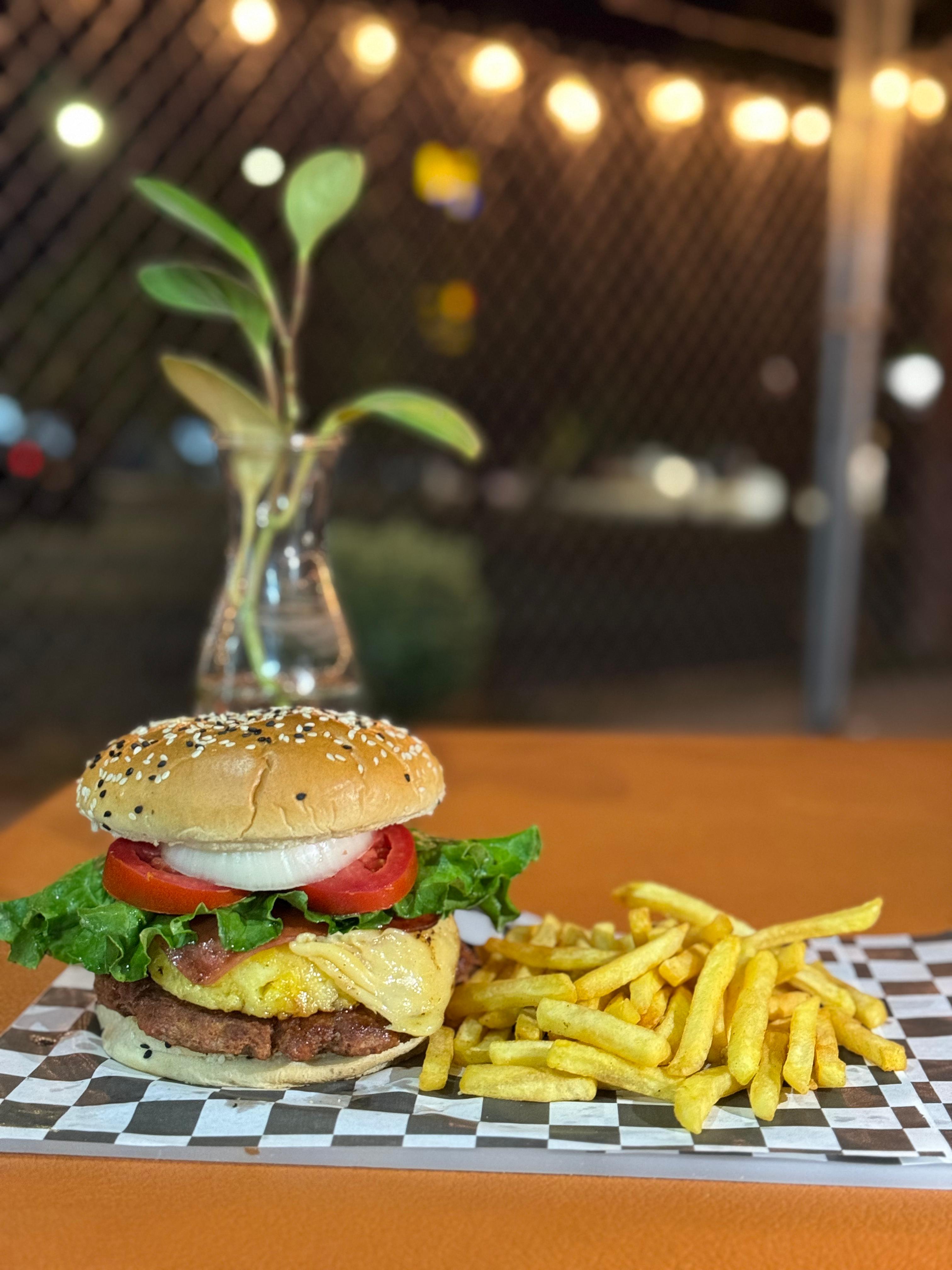 Doble carne casera, con jamón, queso amarillo y vegetales. Incluye papas.