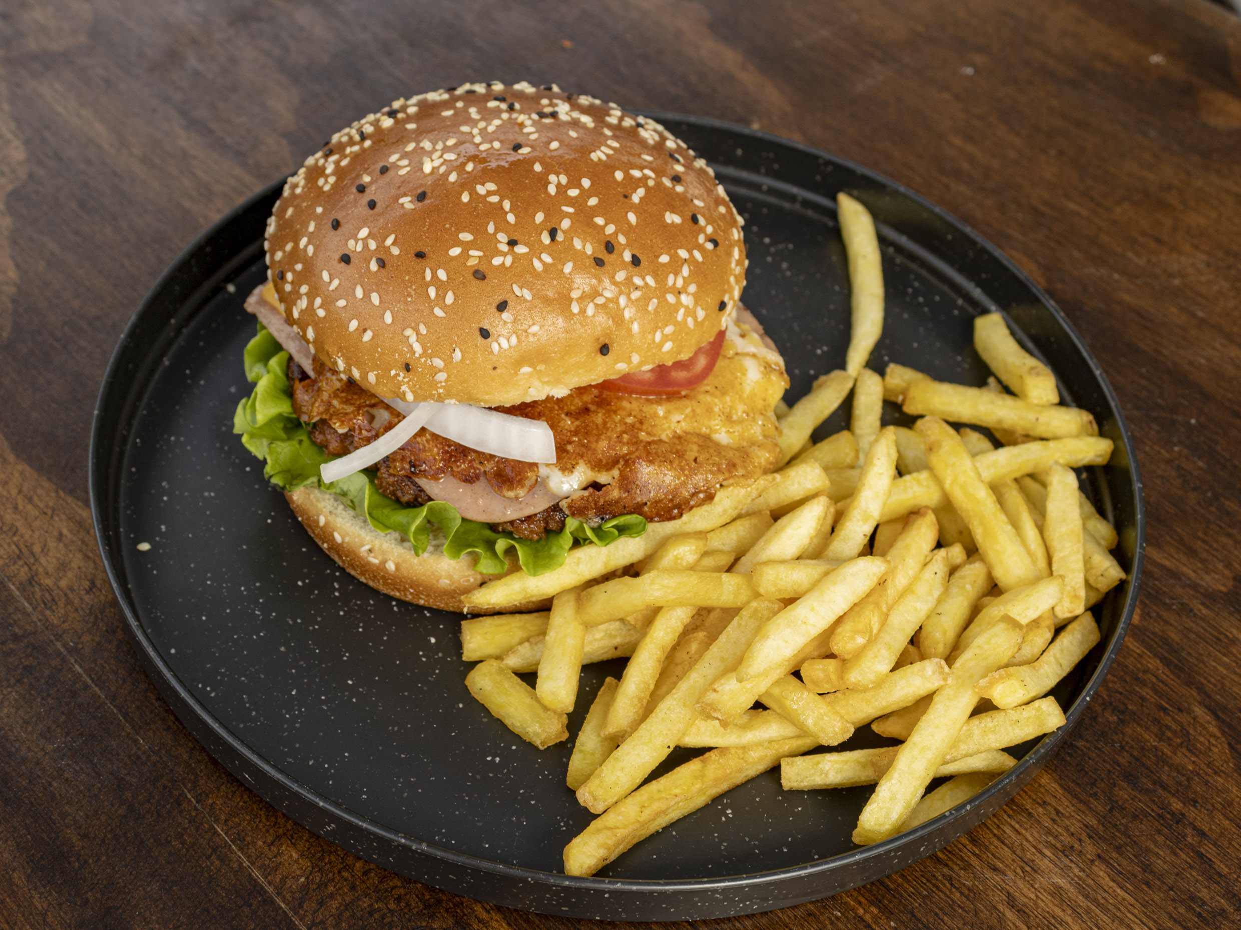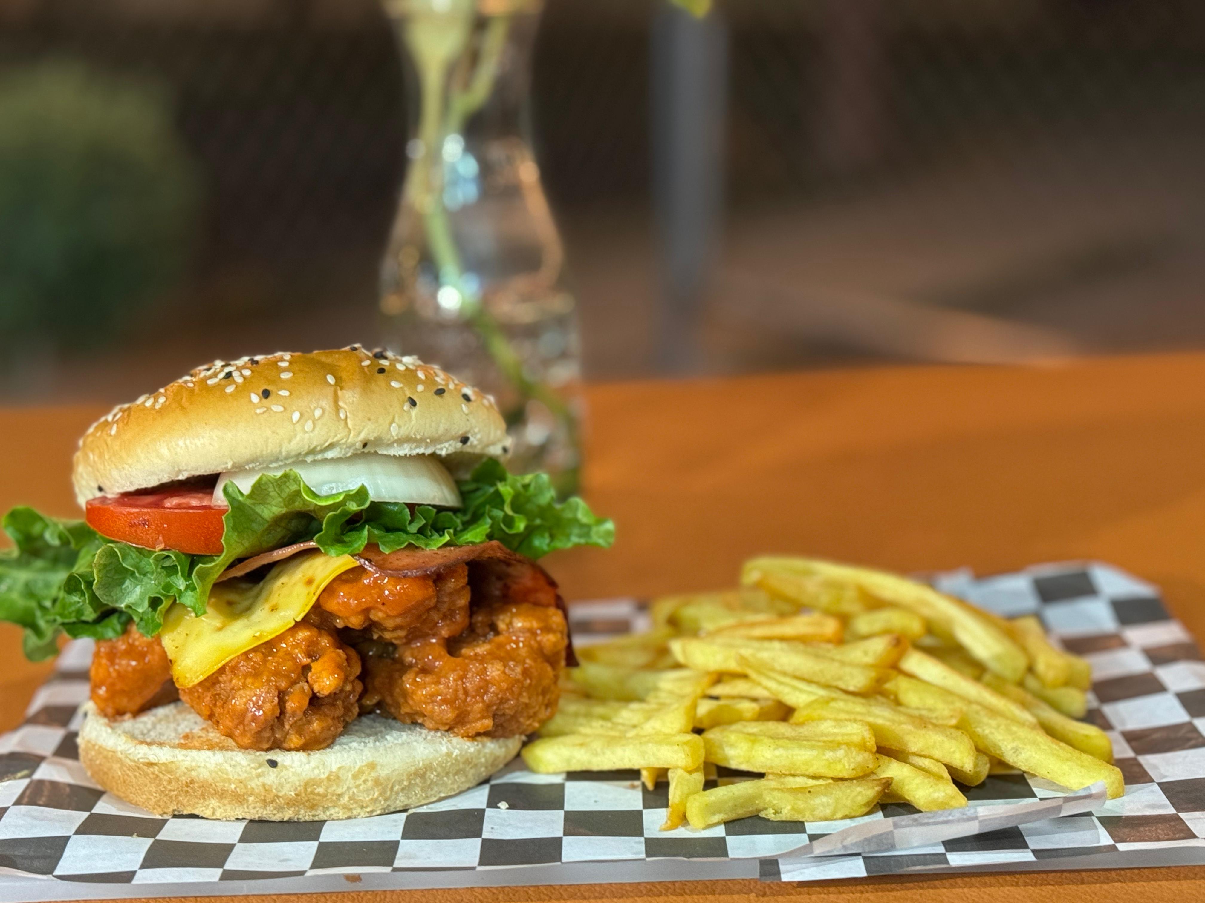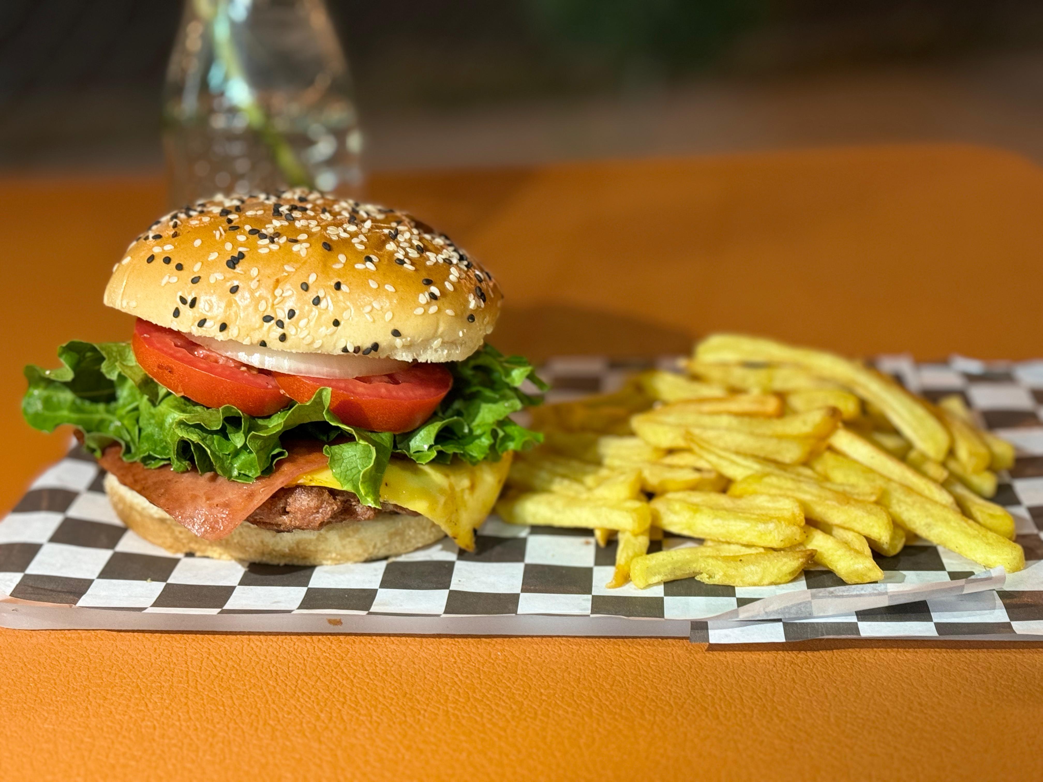 Hamburguesa con boneless, jamón, queso amarillo y vegetales. Incluye papas.