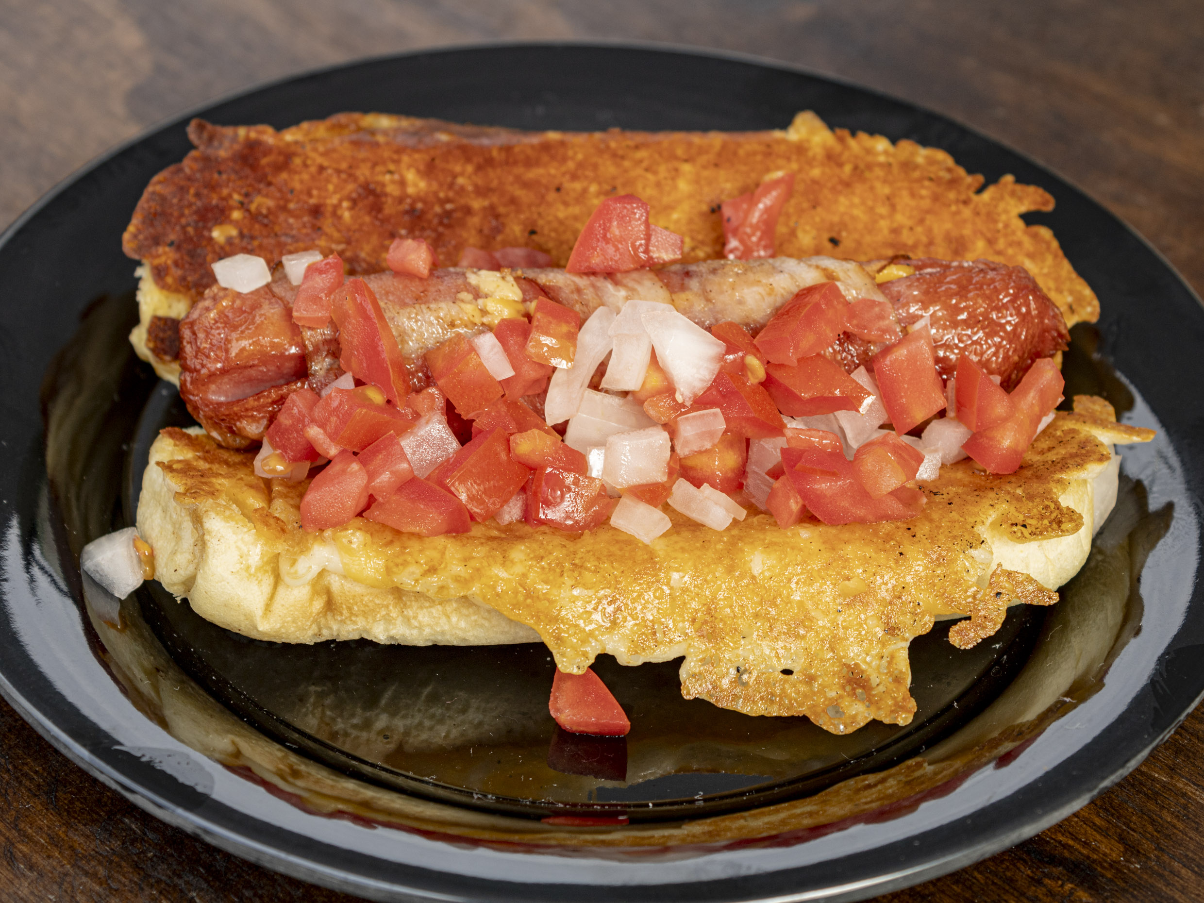 Salchicha de pavo envuelta en tocino y rellena de queso, con una costra de queso blanco