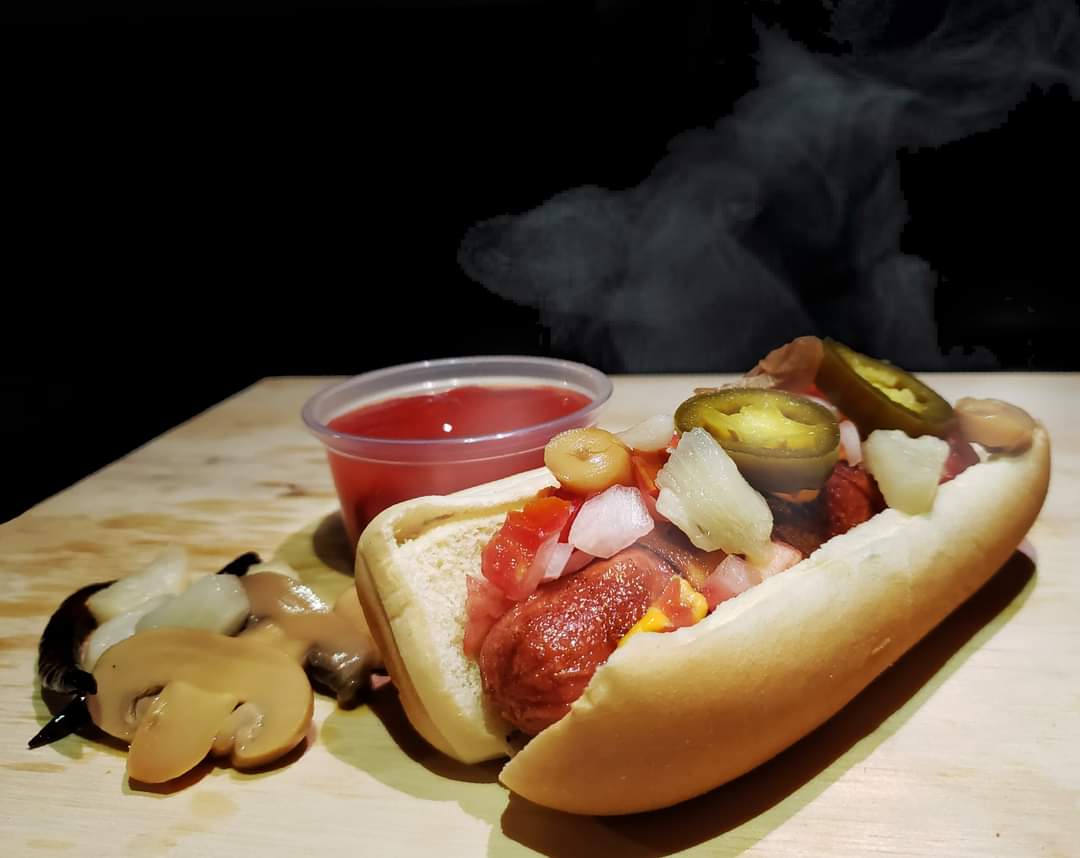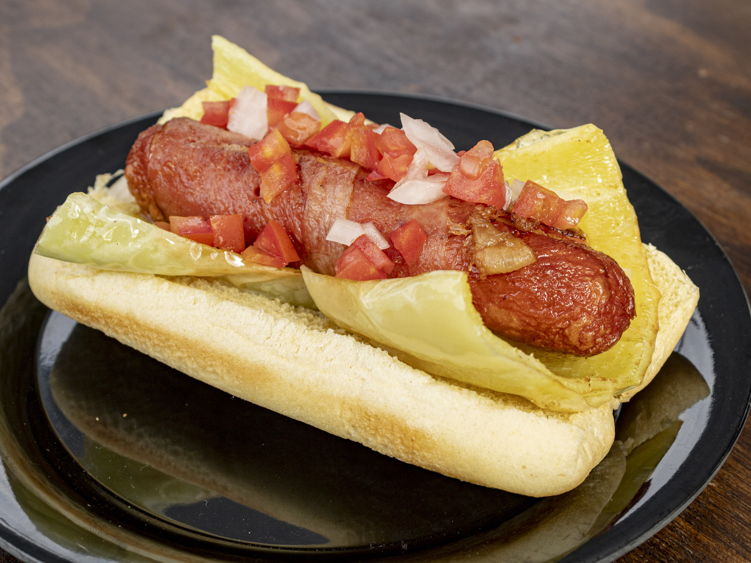 Salchicha de pavo con chile güero, tocino y queso amarillo