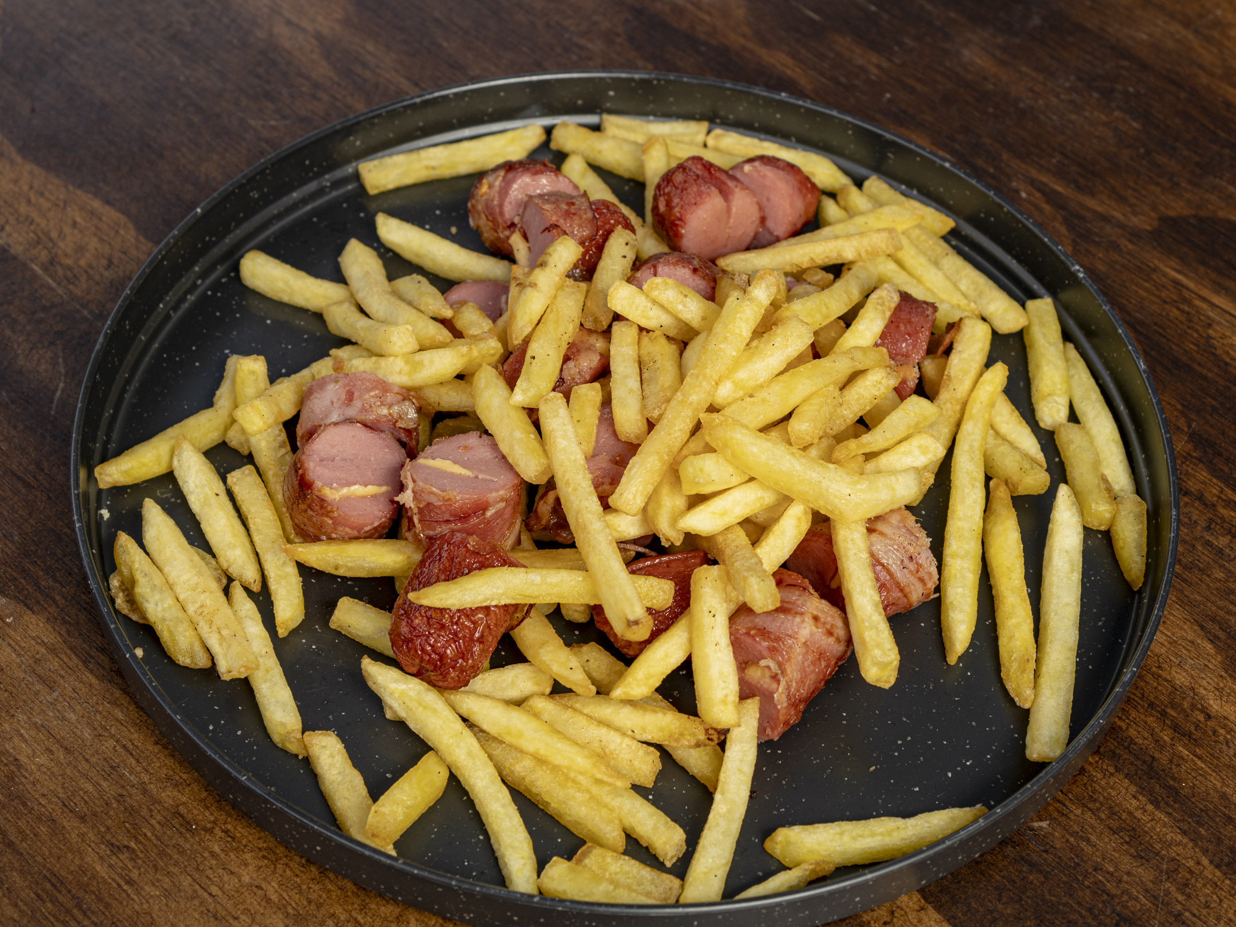 Carne casera, jamón, queso amarillo y salchicha envuelta en tocino. Incluye papas.
