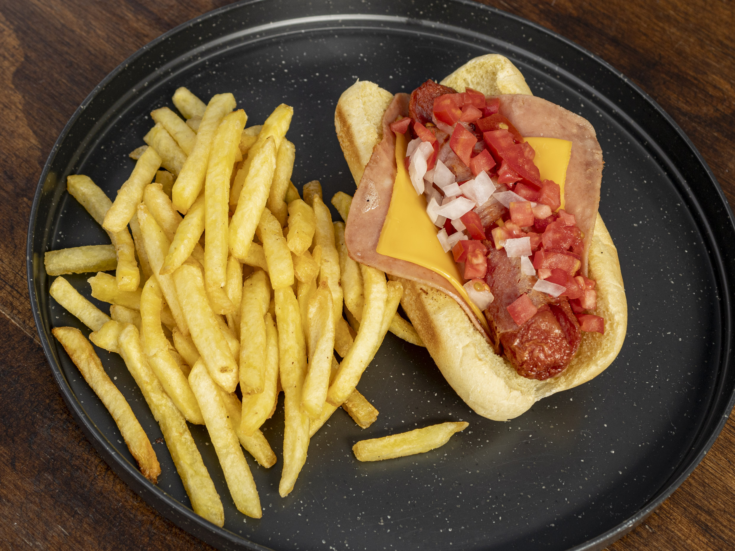 Salchicha de pavo envuelta en tocino y rellena de queso, con rebanada de jamon y queso amarillo. incluye papas.
