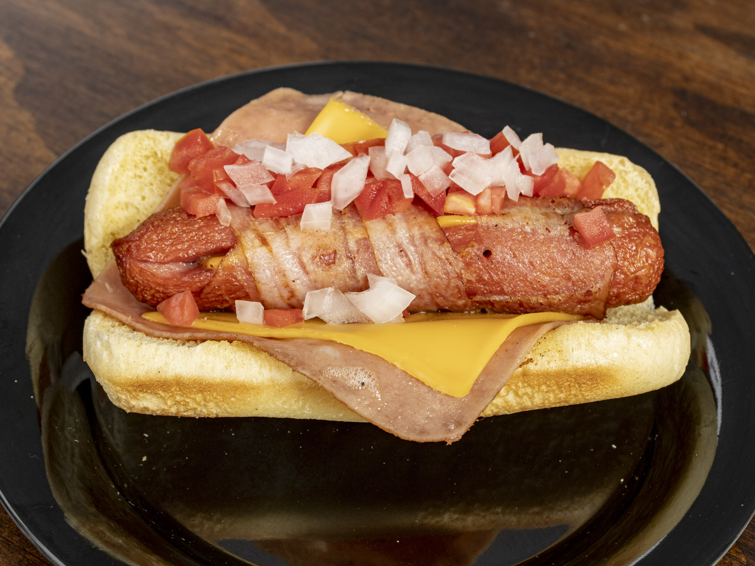Salchicha de pavo envuelta en tocino y rellena de queso, con una rebanada de jamón y queso amarillo.