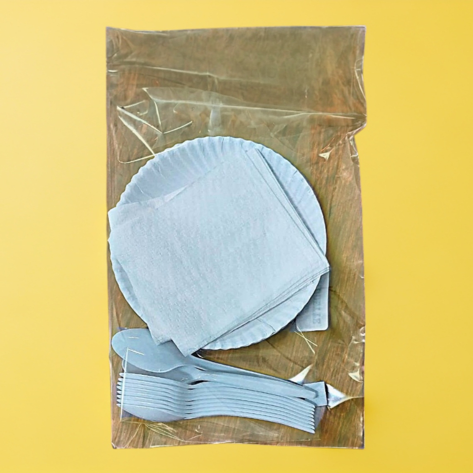 Paquete con 10 platos, 10 cucharas y 10 servilletas