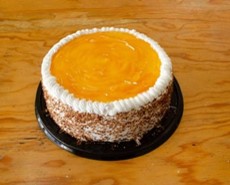 (8-10 Personas), pan de vainilla, relleno de queso con durazno.
