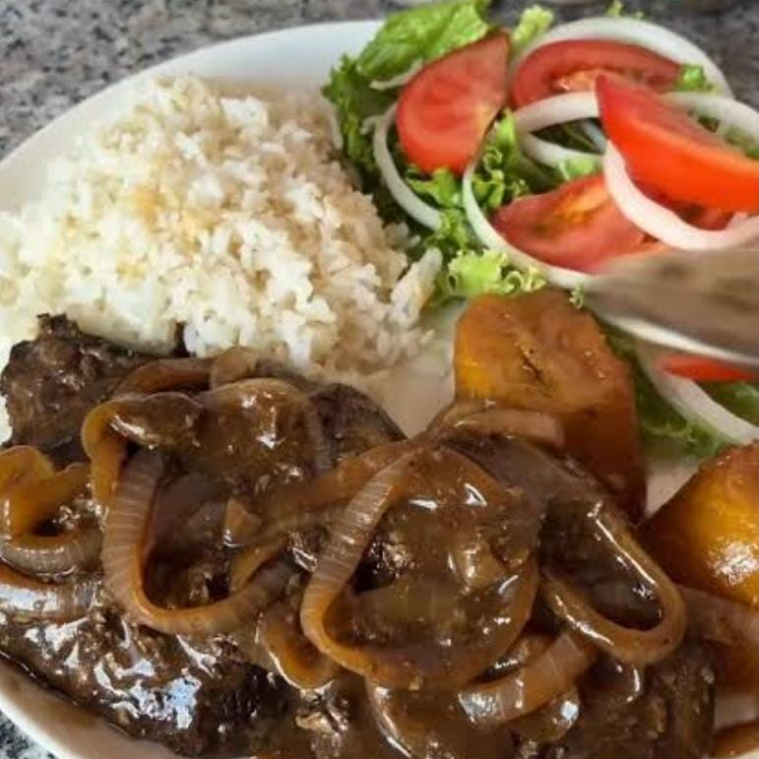 Higado encebollado acompañado de 1 guarnicion y ensalada