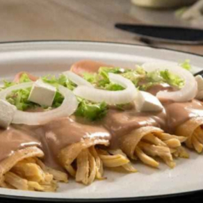 Orden e 4 tortillas con pollo bañadas en frijoles ( peruano) acompañado xon ensalada y salsa