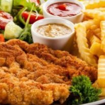 Milanesa de res acompañada de papas a la francesa y ensalada