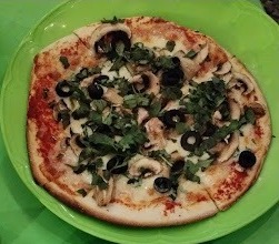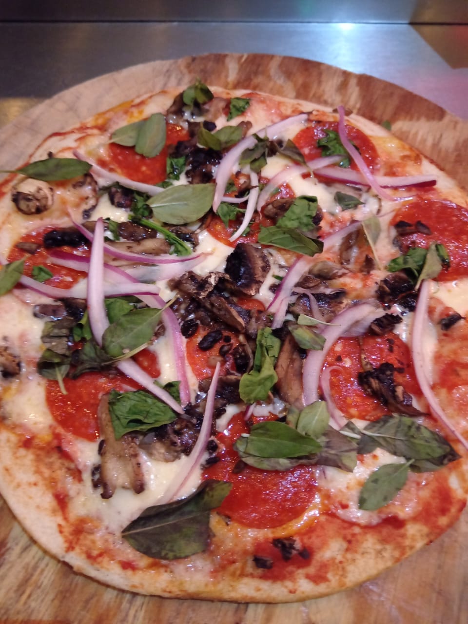 Pizza individual de 25 cm de champiñones, espinacas, pimientos, cebolla, piña, albahacar, especias.