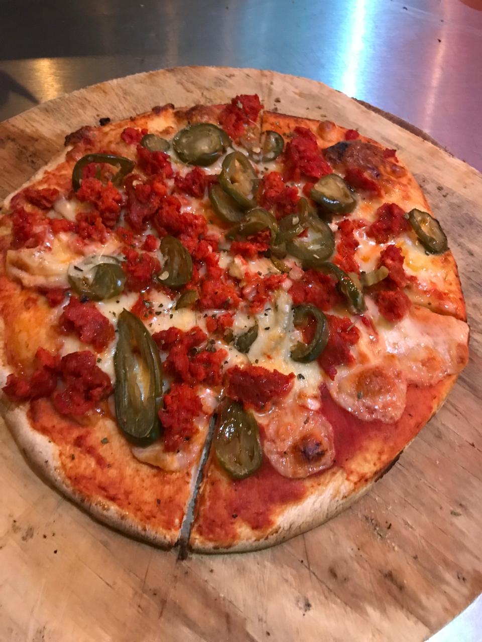 Pizza individual de 25 cm de chorizo, jalapeños, pimientos, cebolla y especias.