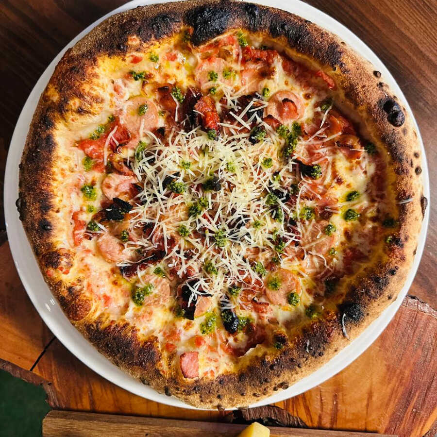 Base de tomate, mozzarella, salchicha Frankfurt, tocino, tomate deshidratado, pesto y parmesano.