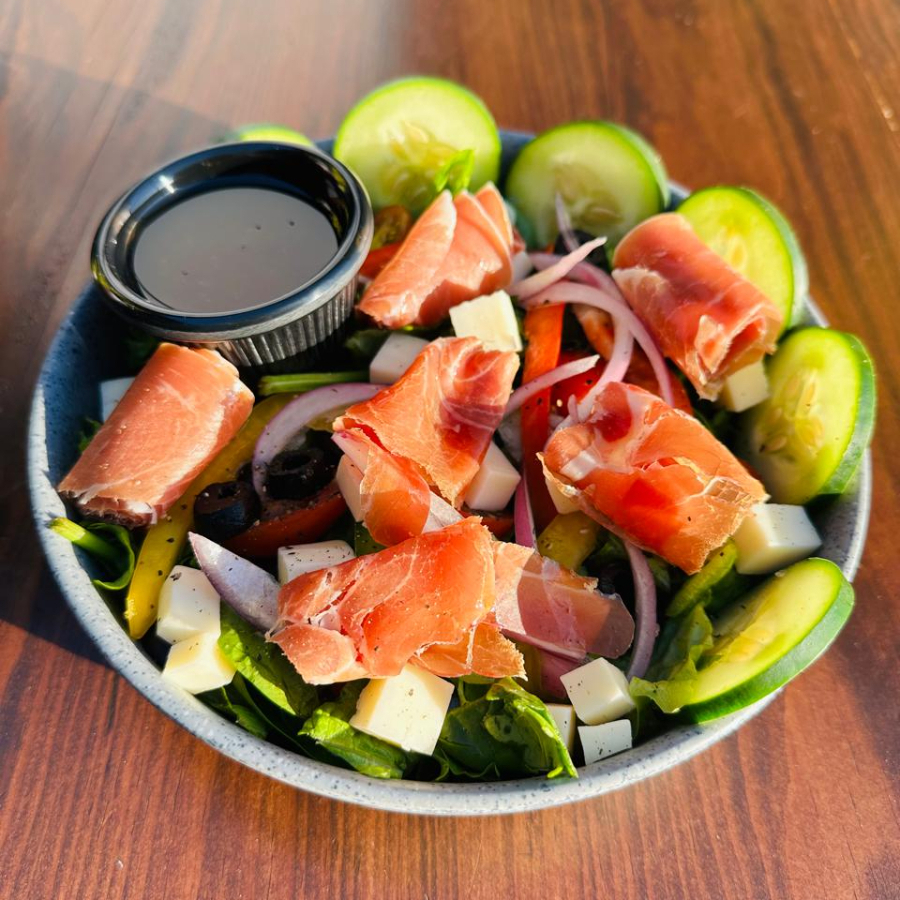 Mezcla fresca de lechugas con espinaca, jitomate cherry, pepino, pimiento verde, cebolla morada, aceituna negra, cubos de mozzarella y jamón serrano premium, aderezada con sal, pimienta y aceite de oliva.