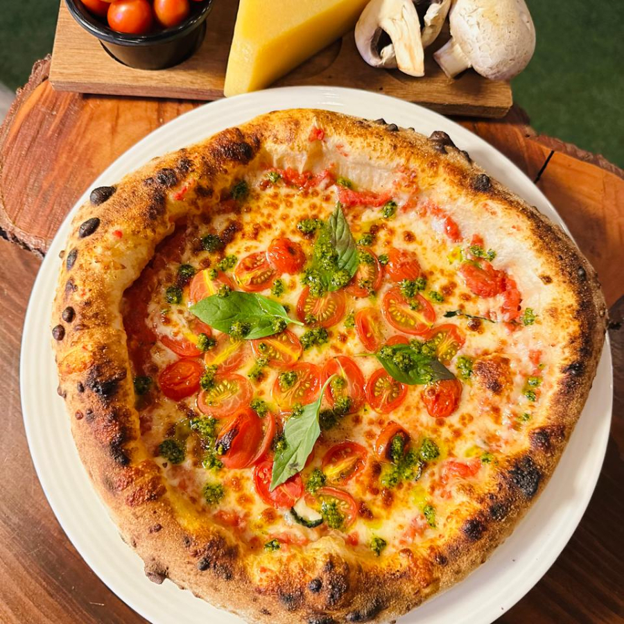 Clásica combinación de base de tomate artesanal, queso mozzarella fundido, tomates cherry, albahaca fresca, parmesano y un toque de pesto.