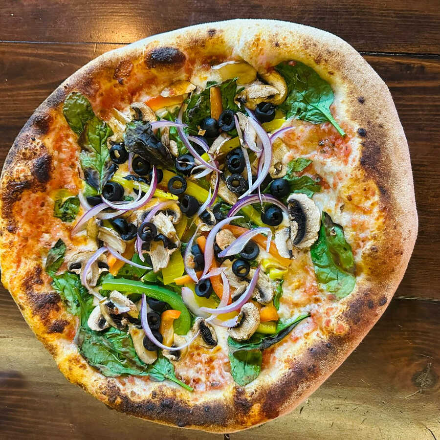 Opción saludable con base de tomate, mozzarella, pimientos, champiñones, aceitunas negras, cebolla morada y espinaca fresca.