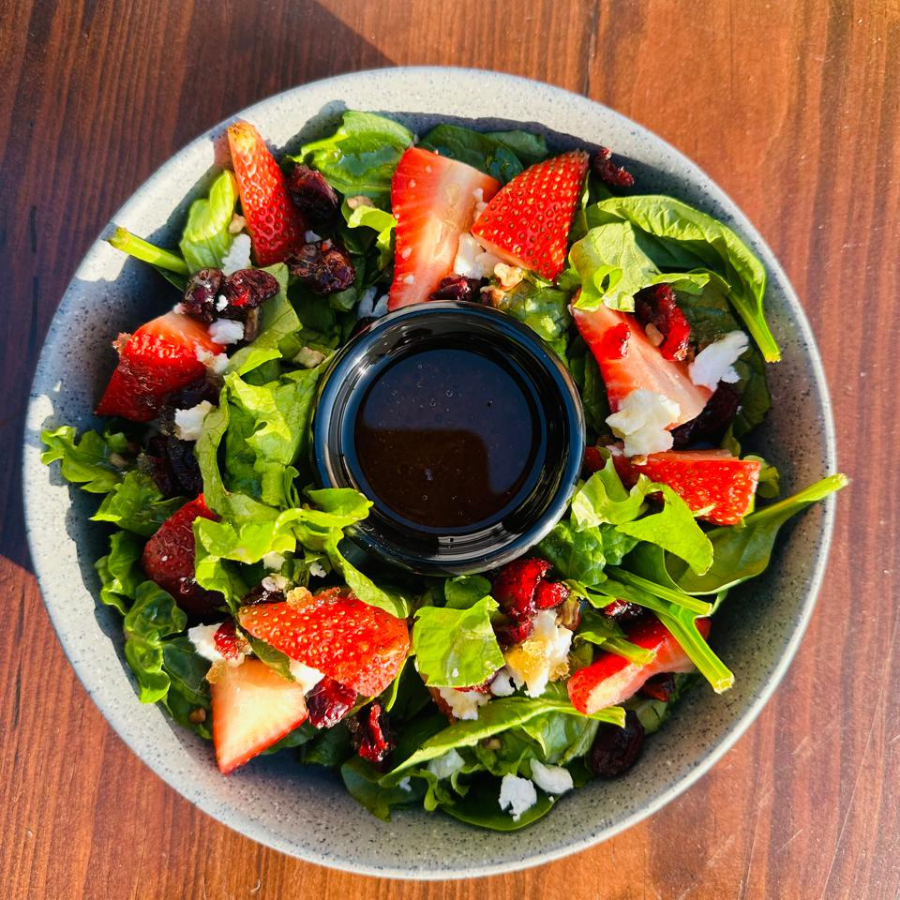 Mix de lechugas y espinaca fresca, fresas dulces, nueces crujientes, queso de cabra cremoso, arándano deshidratado y un toque especial de miel.