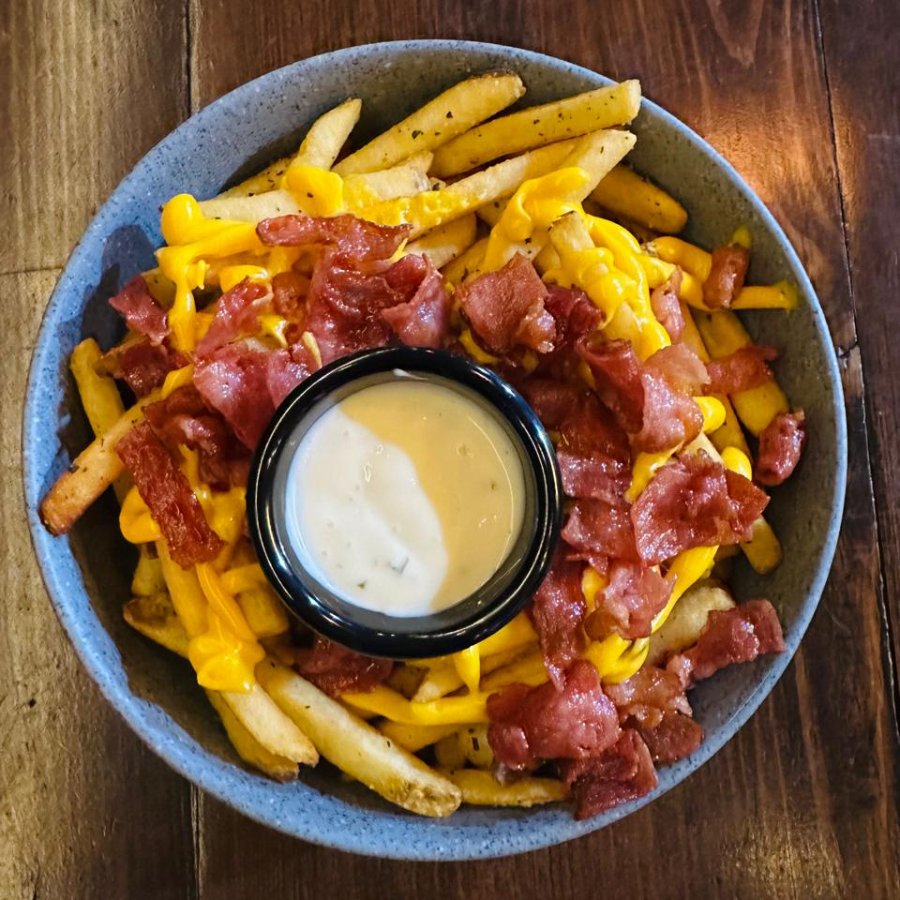 Papas fritas crujientes cubiertas con una generosa capa de queso cheddar fundido y trocitos de tocino ahumado.