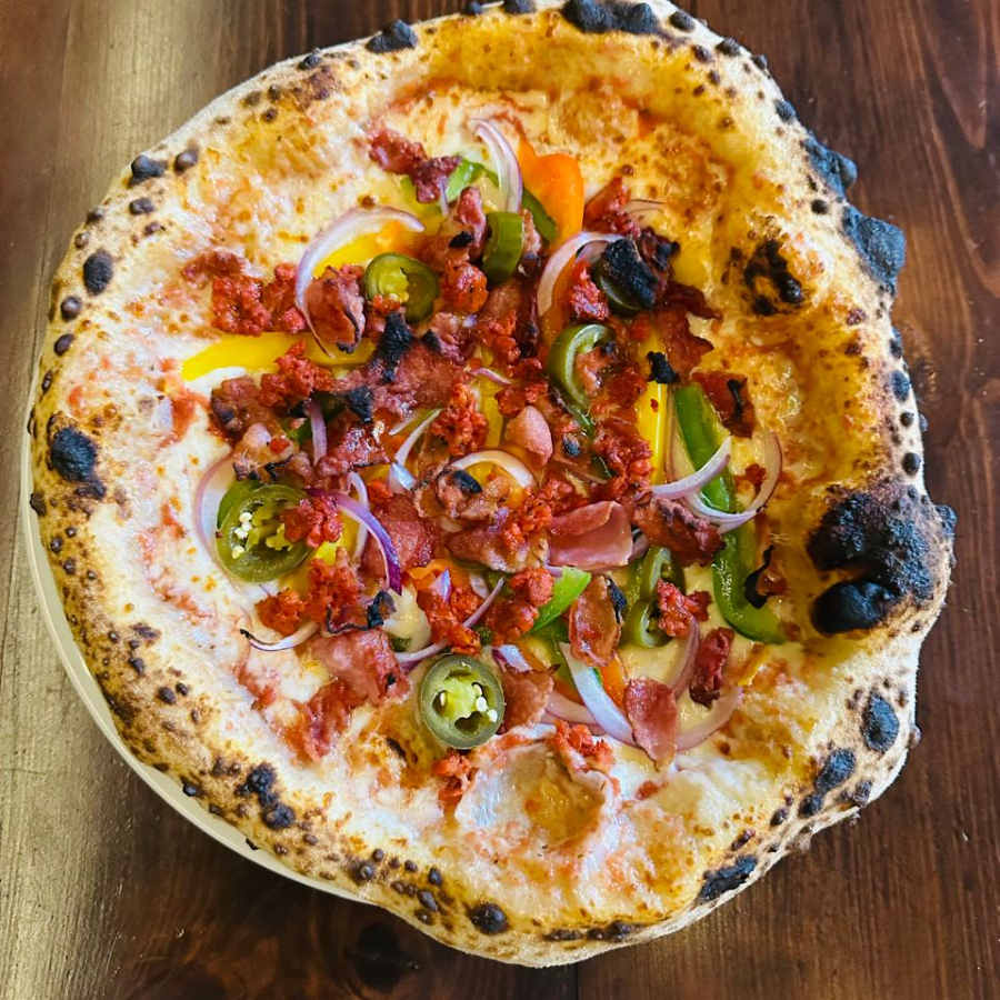 El toque picante con base de tomate, mozzarella, pimientos, cebolla morada, jalapeño, tocino y chorizo ranchero.