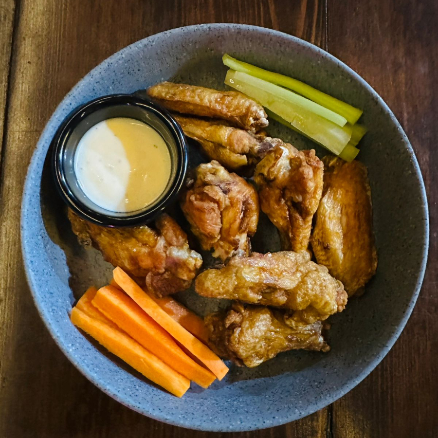 Alitas de pollo jugosas y crujientes, ideales para compartir, servidas con una variedad de salsas intensas.