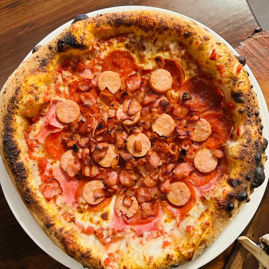 Para los amantes de la carne: base de tomate, mozzarella, pepperoni, jamón de pierna, tocino y salchicha Frankfurt.