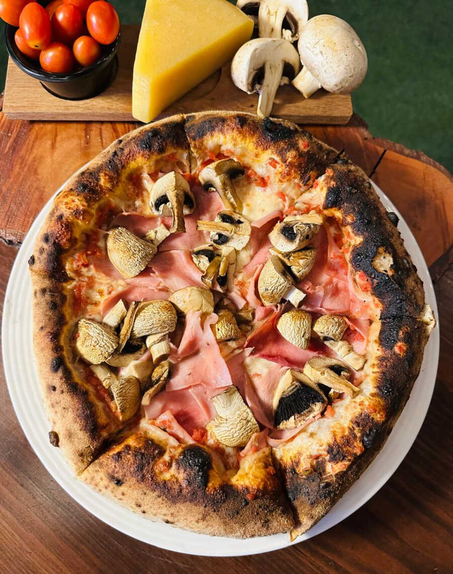 Especial para amantes de los hongos: base de tomate, mozzarella, champiñones frescos y jamón de pierna.