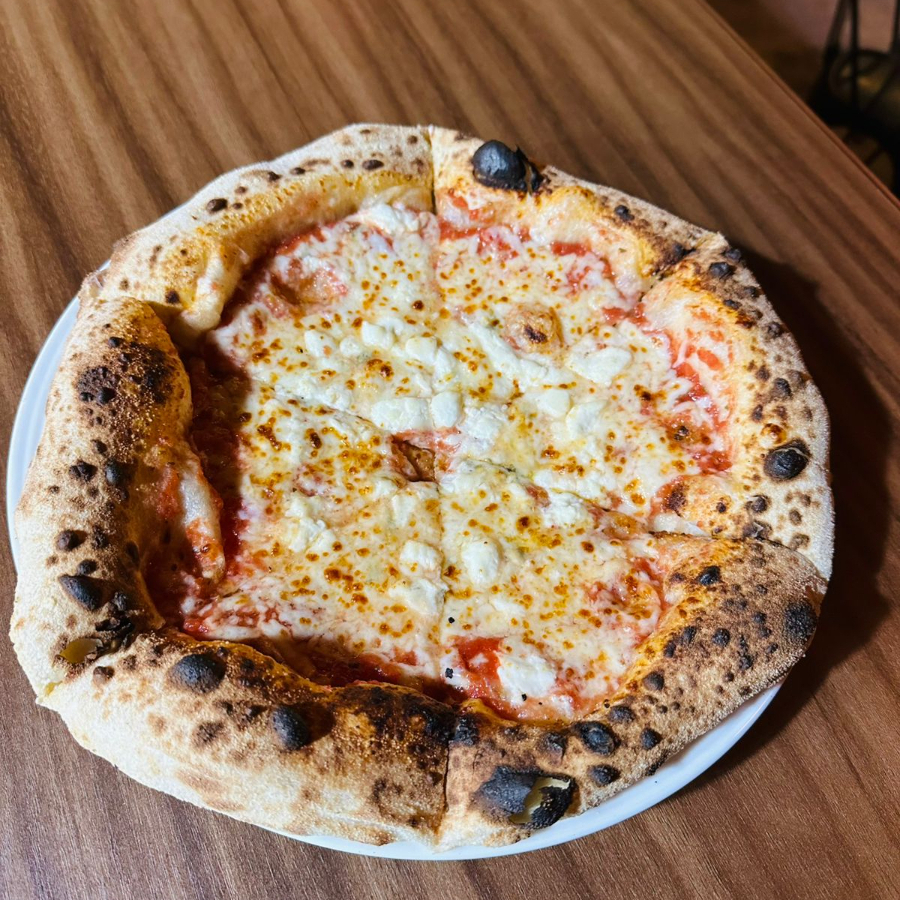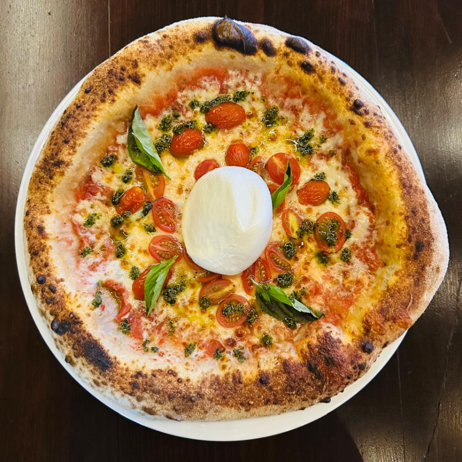 Elevada versión de la Margarita con base de tomate, mozzarella, cherry, albahaca, parmesano y una esfera completa de queso burrata cremosa con toque de pesto.