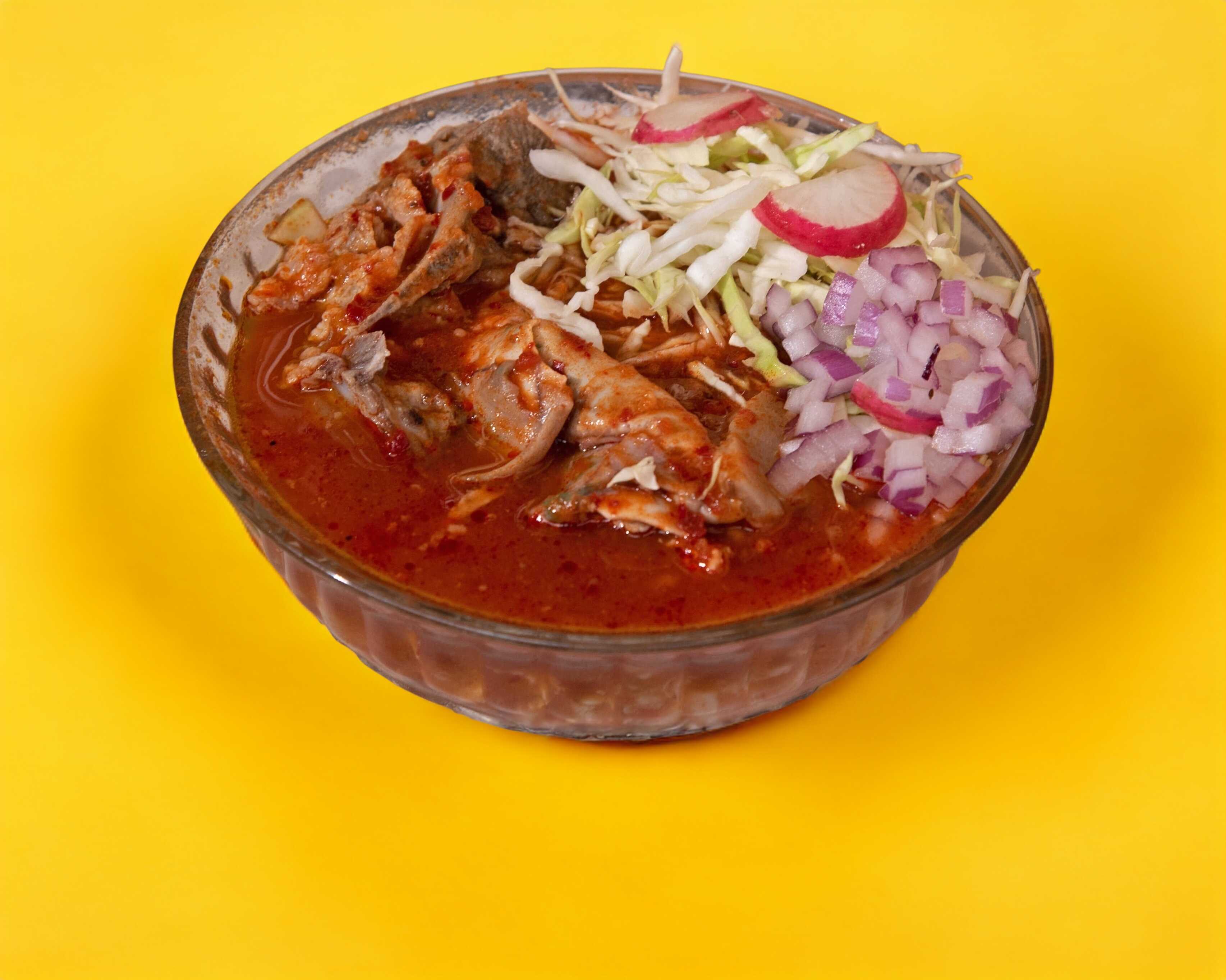 pozole rojo con caldo incluye cebolla, col, salsa, limones y tostadas