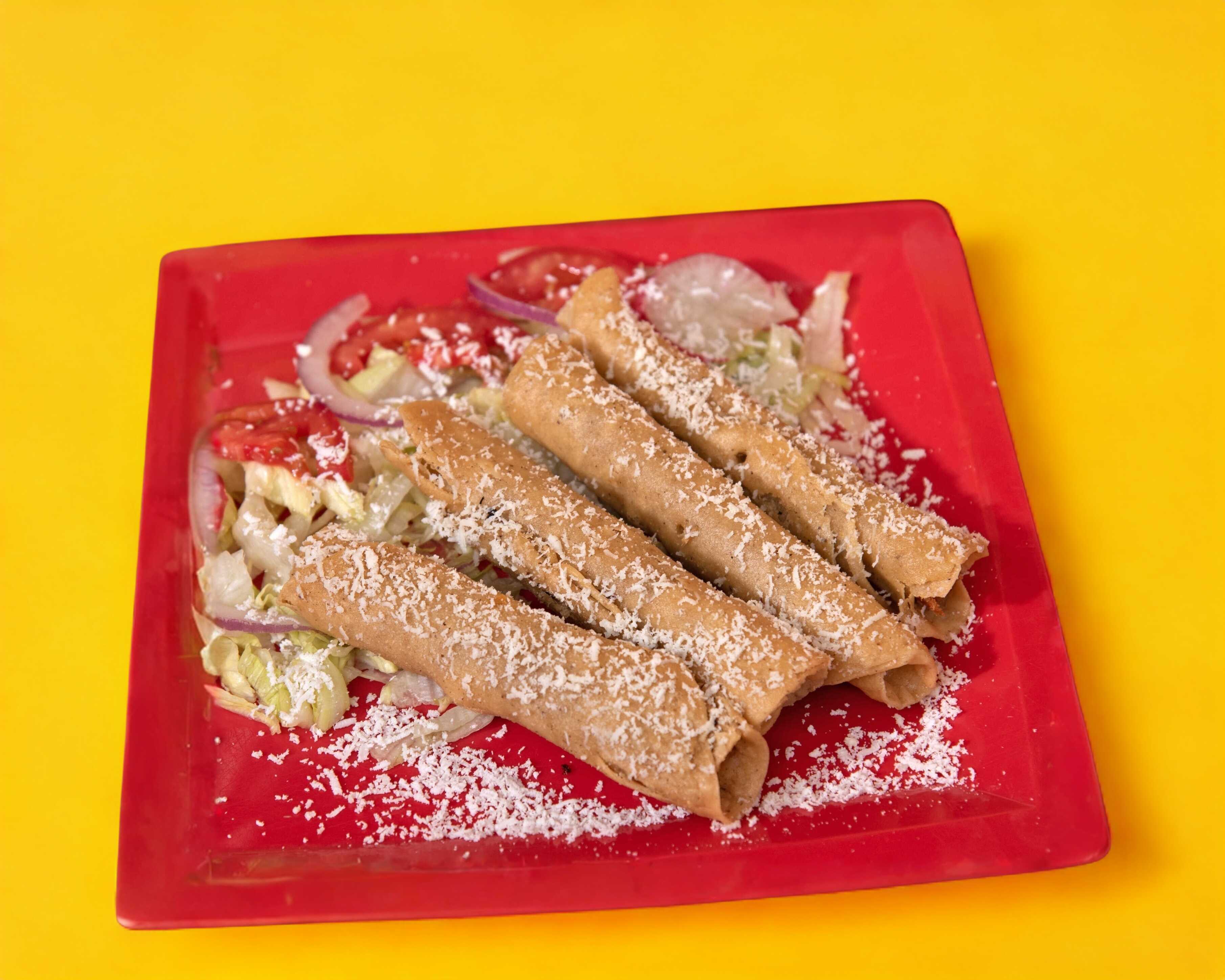 4 Tacos dorados de papa preparados con lechuga, cebolla y queso