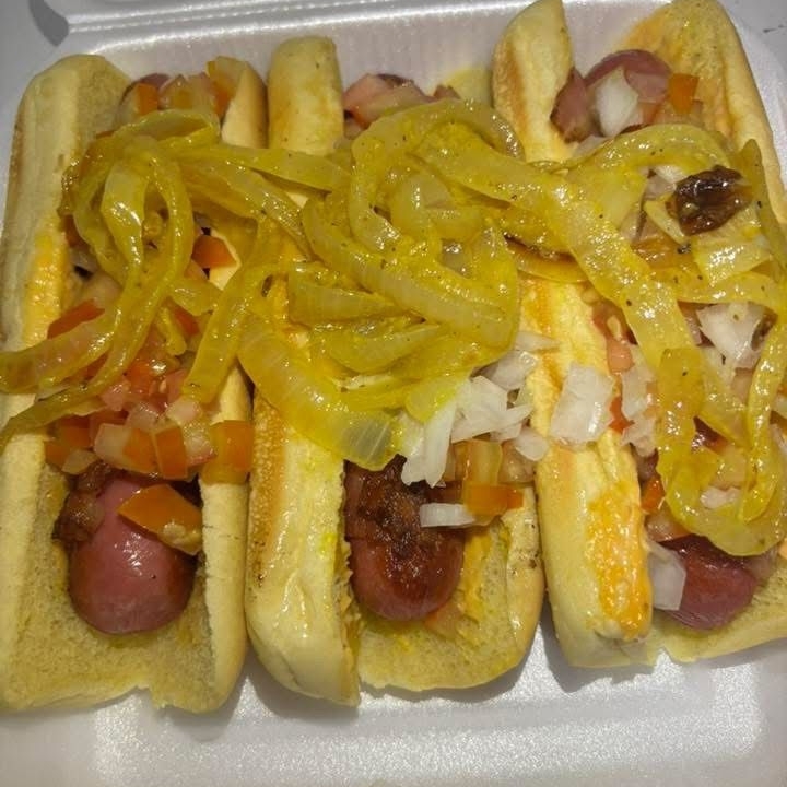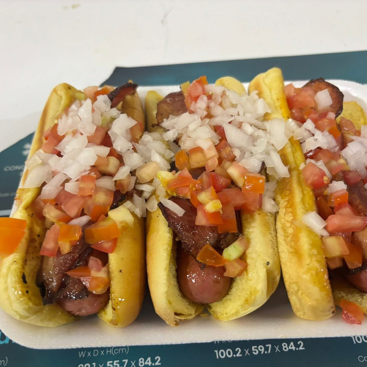3 hot dogs con salchicha envuelta en tocino ,jitomate y cebolla (aderezos y complememtos para acompañar )