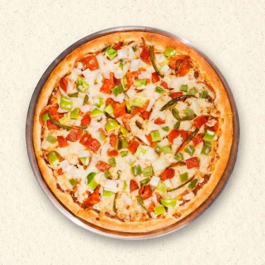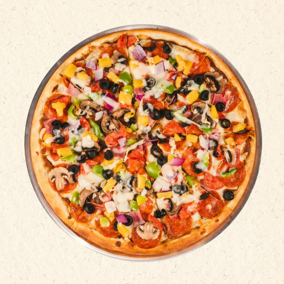 Con pepperoni, chorizo, jamón, pimiento verde, champiñones, piña, aceitunas negras, jalapeño y cebolla. 35 cm de 8 rebanadas. (3 personas)